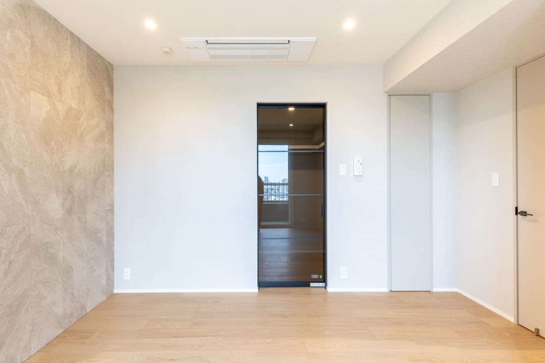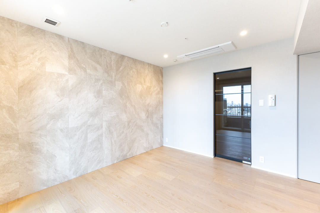 約8.4帖のゆとりある寝室1。柔らかく安定した明るさを確保しやすい北西向きのお部屋です。石柄のアクセントウォールが上質な空間を演出。ビルトインエアコンを採用し、生活感を抑えながら室内全体を快適に保てるのも嬉しいポイントです。インターホン完備で、急な来客時にもリビングまで足を運ぶことなく応対可能。主寝室にぴったりの空間です。