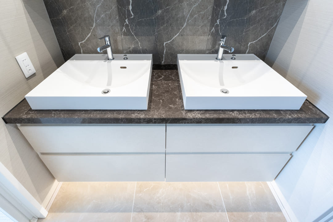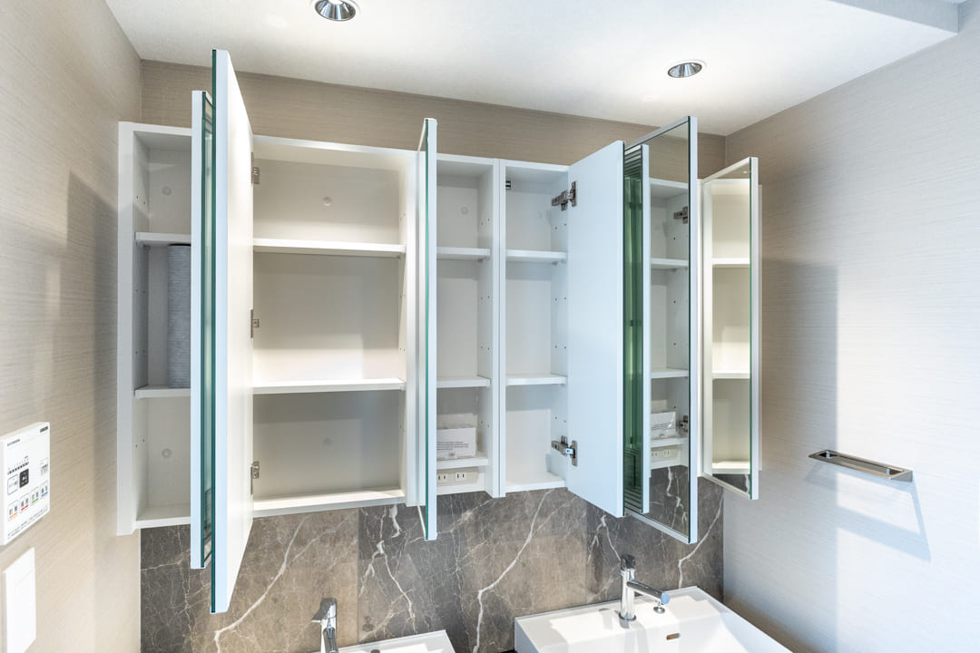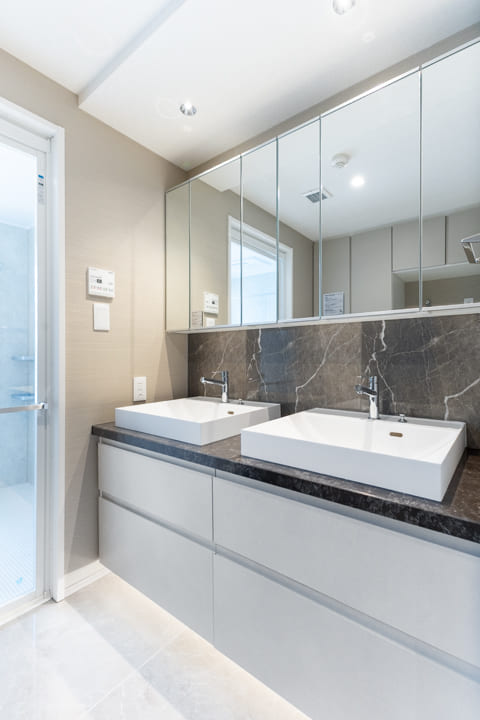 石柄デザインが高級感を演出する洗面化粧台。ホテルライクな2ボウル仕様です。2人並んで使用でき、忙しい朝の身支度にもゆとりが生まれます。ミラーボックスや足元の引き出しに加え、背面には大容量のリネン庫を設置。洗面まわりの小物からタオル・パジャマ類まですっきり収まり、いつも清潔な空間を保つことができます。