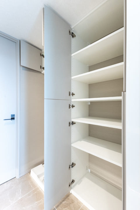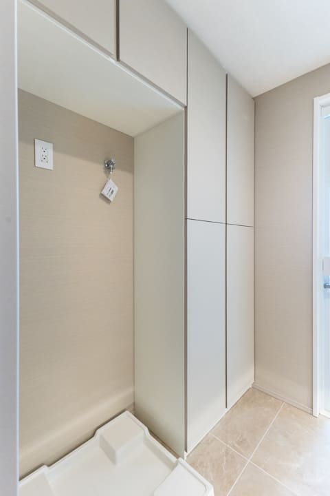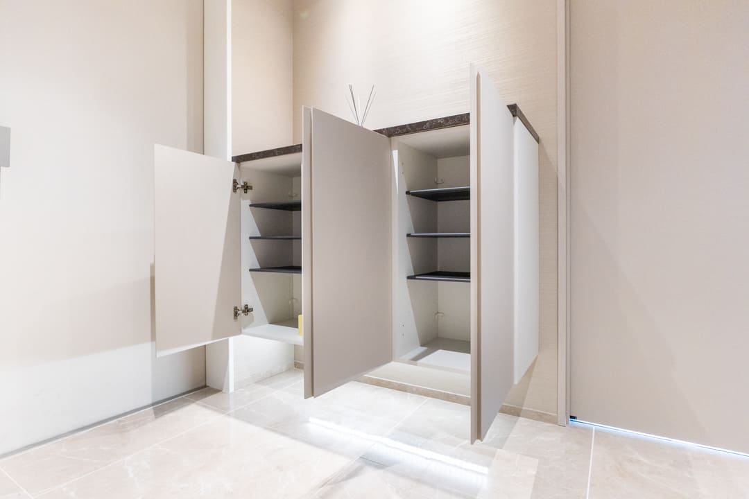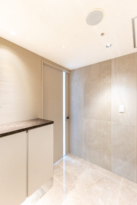 人感センサー付き照明が、帰宅時をやわらかな光で迎える玄関。石柄フロアやアクセントウォールが、上質な雰囲気を演出しています。カウンタータイプのシューズボックスに加え、SIC(シューズインクローゼット)も備えた収納豊富な設計。散らかりがちな靴もすっきり収まり、来客時にも清潔感のある空間でお迎えできそうです。