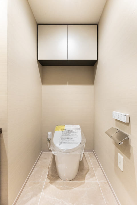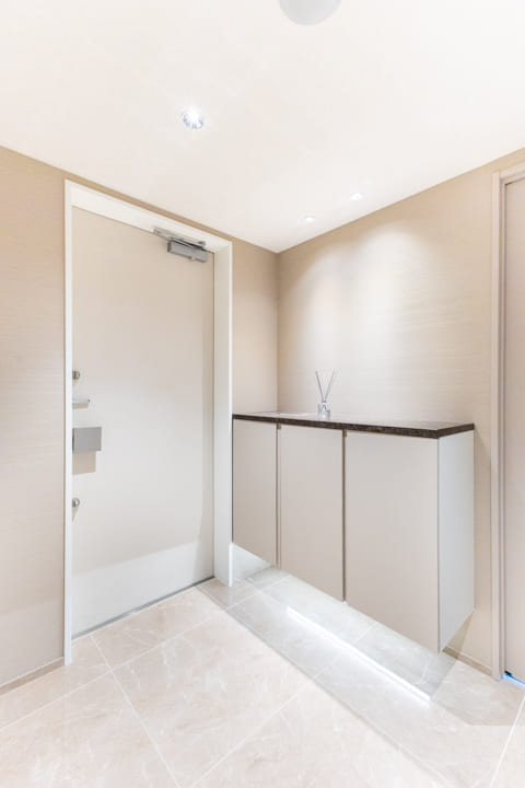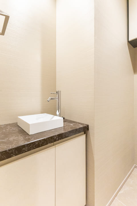 廊下に面し、独立性を確保したレストルーム。TOTO製の洗浄機能付トイレへ交換済みです。便フタは自動開閉式のため、直接触れることなく使用できて衛生的。石調カウンターが美しい手洗いスペースも設けられており、ゲストを洗面室へ案内することなくお使いいただける設計です。