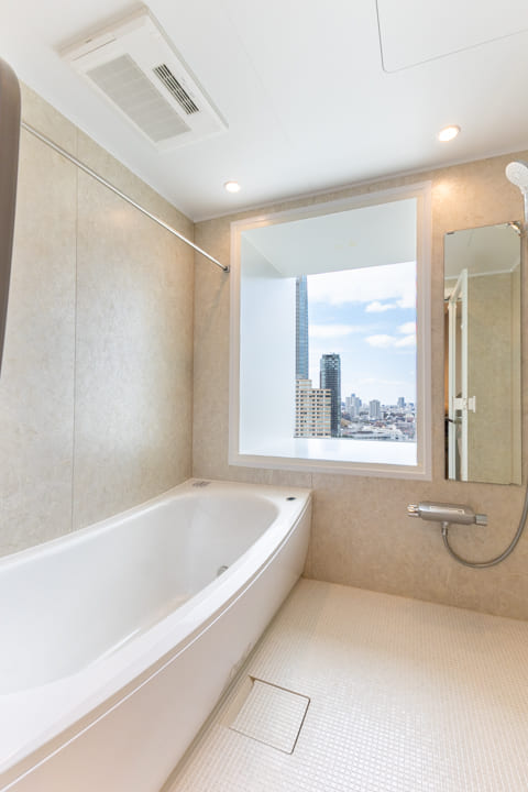 ゆったりと入浴を楽しめる、1620サイズのビューバス。大きな窓の先には、都心らしい開放的な眺めが広がります。湯船に身をゆだねながら景色を望み、心ほどけるひとときを過ごせそうです。換気・暖房・乾燥・涼風機能を備えており、1年を通して快適なバスタイムをサポート。雨天時の洗濯乾燥や湿気対策にも役立ちます。さらに追い焚き機能付きで、ご家族の入浴時間がずれた際や半身浴を楽しみたい時にも便利です。