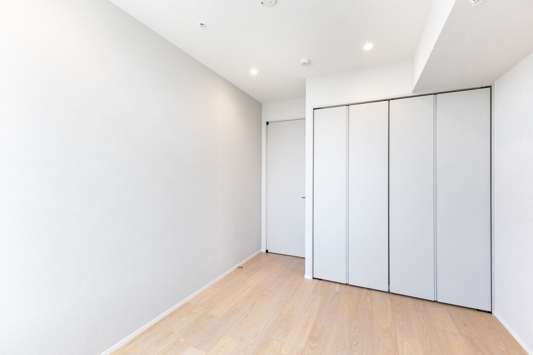約6.7帖の寝室2。大きな窓の先には遠く広がる青空を望み、のびやかな眺めが広がります。カウンターに小物やグリーンを飾り、窓辺の景色とともに楽しめるのも魅力。収納には4枚折れ戸のクローゼットを採用しています。衣類や鞄などもすっきり収まり、開口部が大きく出し入れしやすいのもポイントです。
