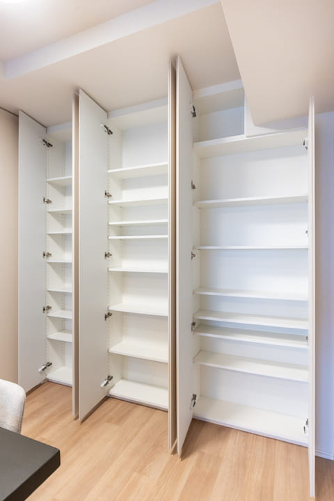 リビングには複数の可動棚と約0.7帖のDENを確保。可動棚は収納するものに合わせて柔軟に使え、空間を無駄なく活用できます。DENには掃除機など高さのある荷物も収めることができ、生活感を抑えたすっきりとした居住空間を実現します。