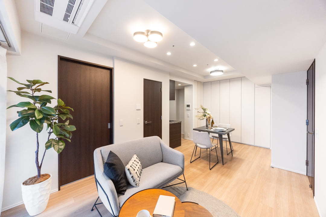 約12.7帖のLDK。西向きのバルコニーに面し、明るく開放感のある空間です。折り上げ天井が奥行きを生み、より広がりを感じさせます。木目の美しいフローリングと建具を基調としたナチュラルで洗練された内装も魅力。さまざまなテイストの家具と調和しやすく、お手持ちのインテリアともコーディネートしやすい空間です。