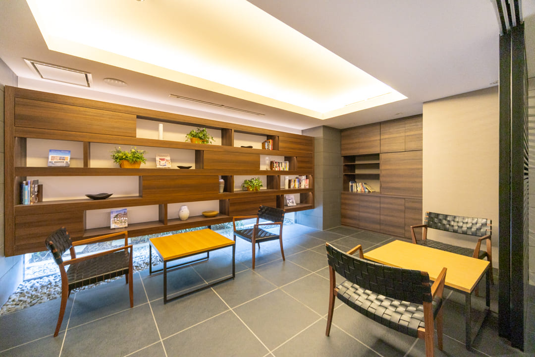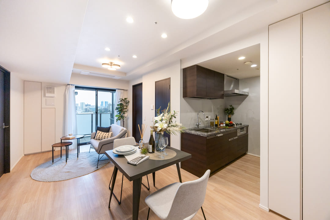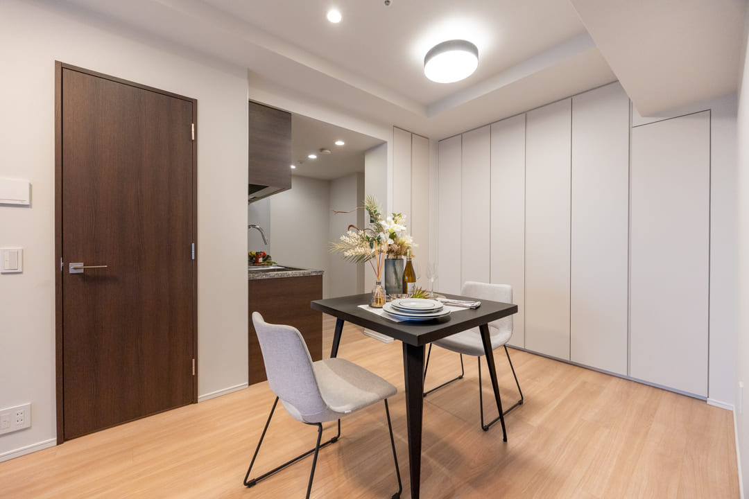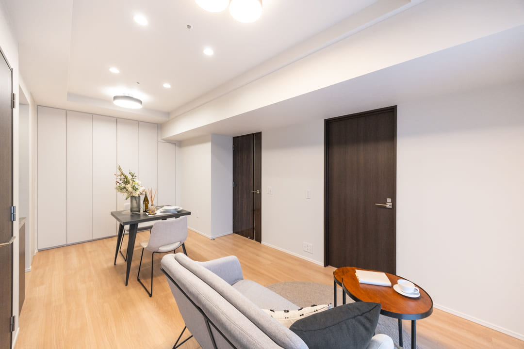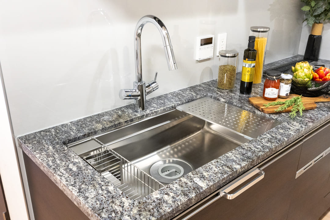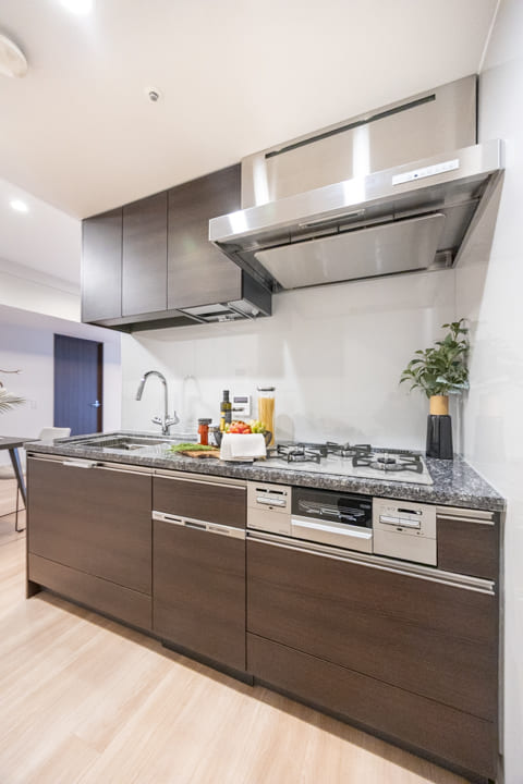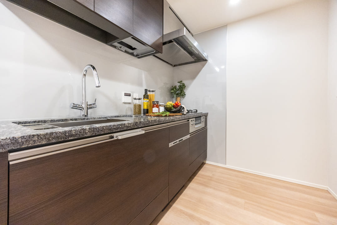 生活空間から程よく切り離された独立型キッチンは、落ち着いて調理に集中できる上質な設計。石調カウンターが重厚感を添え、空間全体に洗練された印象をもたらします。キッチンまわりの生活感をさりげなく抑えられるほか、調理中のにおいがリビングへ広がりにくい点も魅力です。