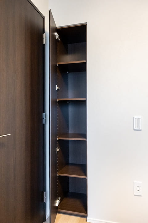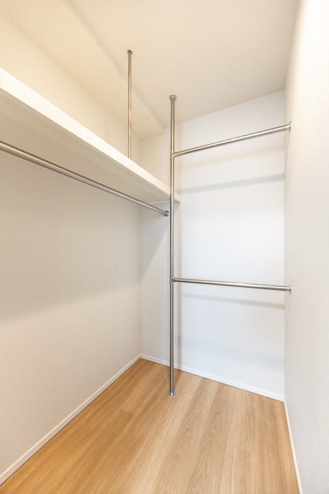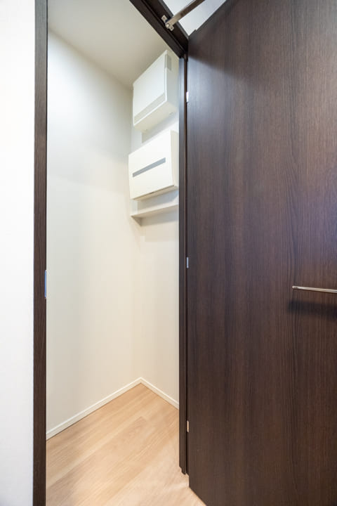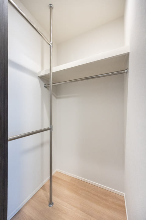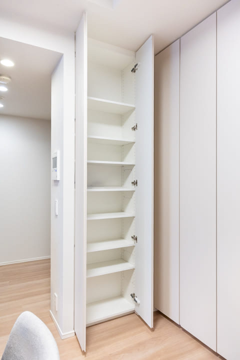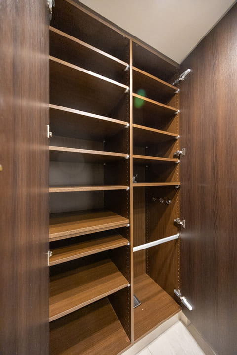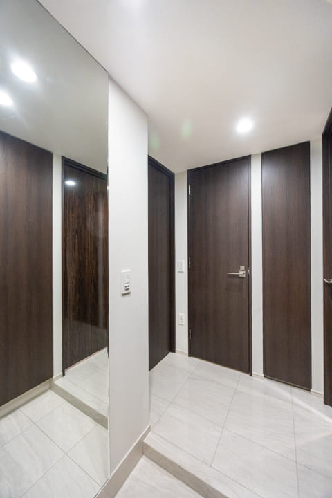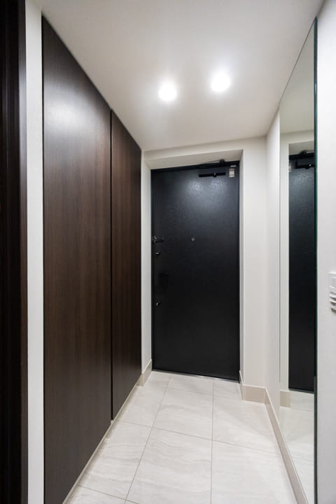 大きな鏡が空間に広がりをもたらす、上質な玄関ホール。靴を履いたままコーディネートチェックができるのも嬉しいポイントです。トールタイプのシューズボックスを備え、収納力も十分。可動棚仕様のため、ロングブーツや雨具もすっきり収まります。さらに廊下には物入もあり、日用品の収納にも便利です。