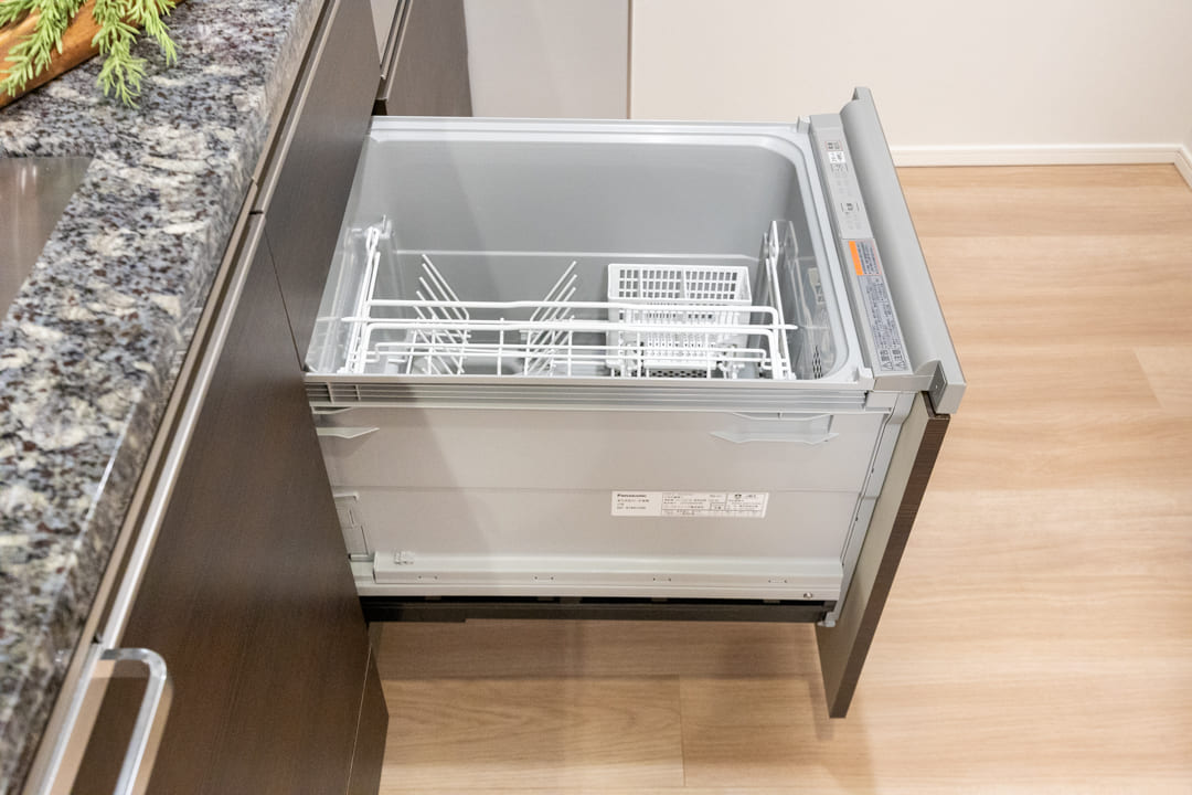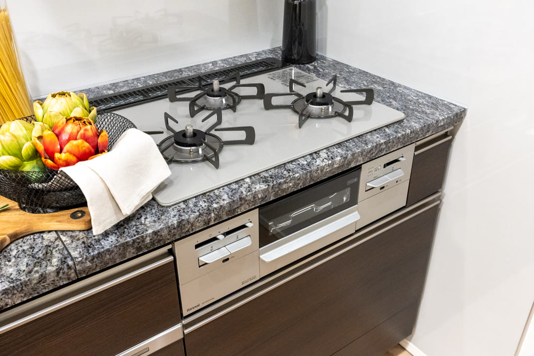 同時調理が叶うグリル付3口ガスコンロを内蔵。さらに、ディスポーザーと食洗機も完備されています。料理後すぐに生ゴミを処理できるので、悪臭の原因を防ぎ、掃除の手間を軽減。食器洗いも捗り、後片付けの時短が叶います。