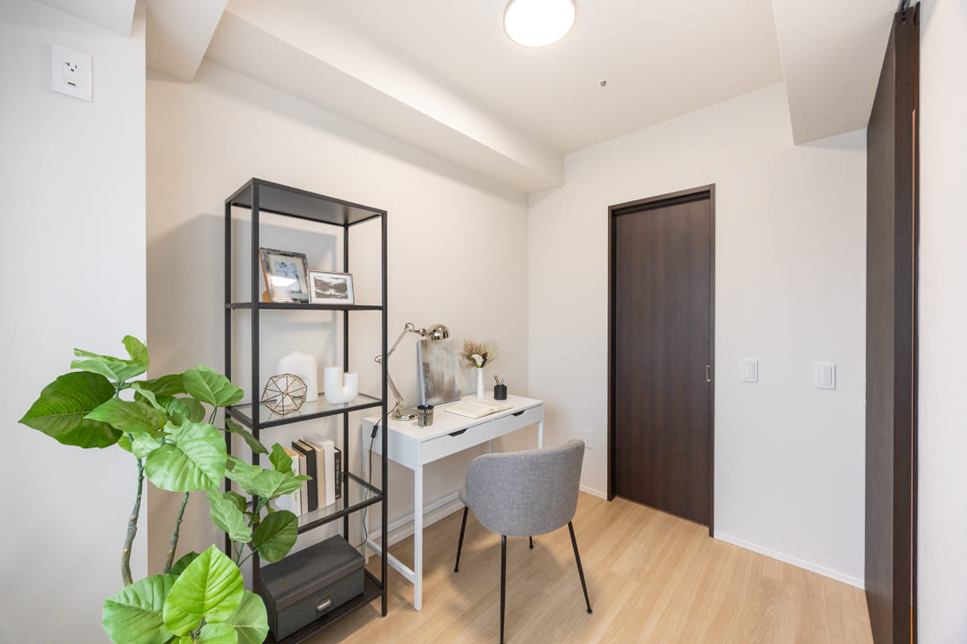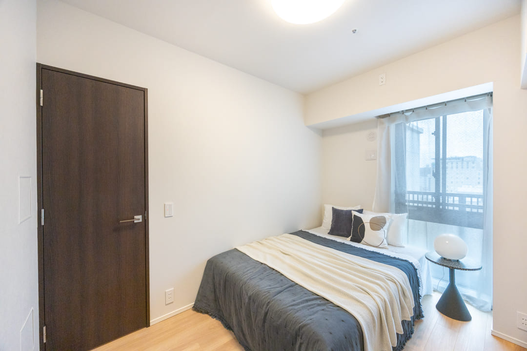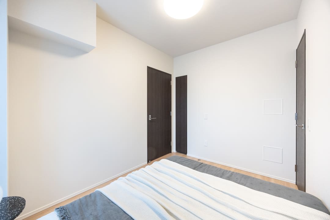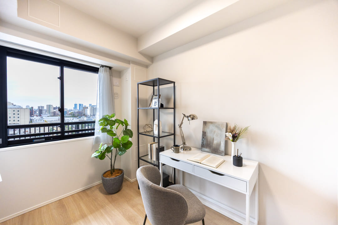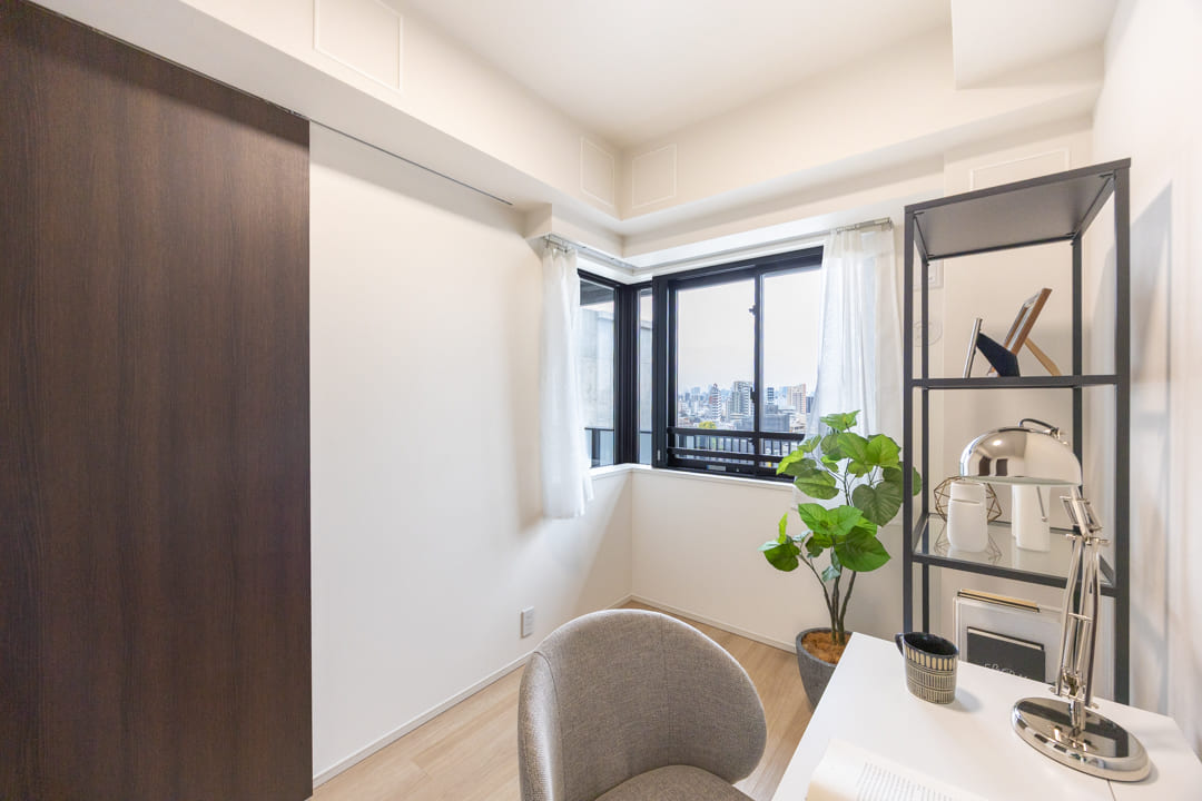 約4.0帖の寝室2。南西の二面採光により、あたたかな陽光が差し込む明るい空間です。バルコニーに面し、眺めも良好。こちらにもWIC(ウォークインクローゼット)を備え、収納力も確保されています。ワークスペースや趣味部屋としてもおすすめです。