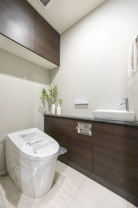 廊下に面していて独立性の高いレストルーム。TOTO製のネオレストに新規交換済みです。洗面台とデザインを揃えた手洗いカウンターを設け、機能性と意匠性を兼ね備えた空間に仕上げています。ゲストを洗面室まで案内する手間がなく、さりげない使い心地の良さが感じられます。