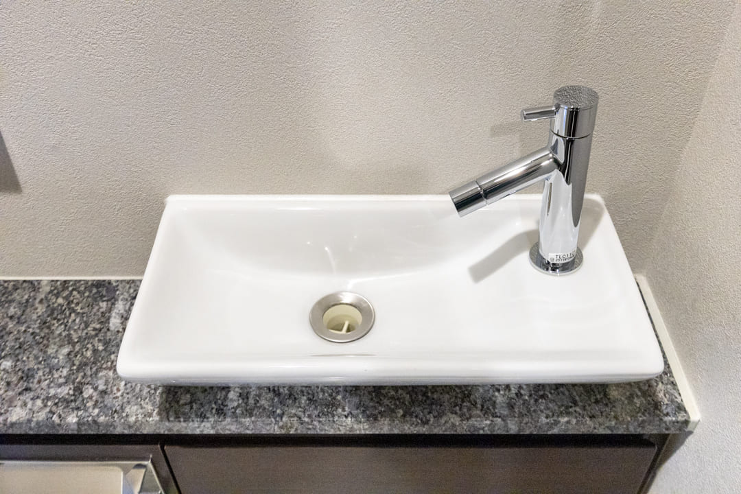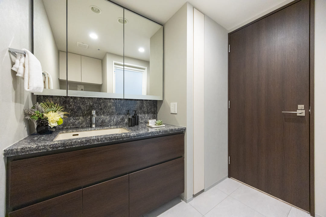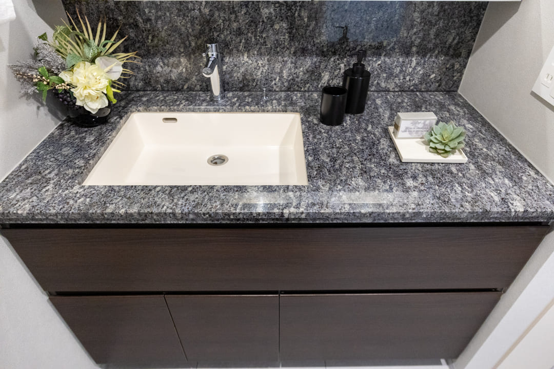 石目調カウンターを採用し、ホテルライクな雰囲気が漂う洗面化粧台。大きな三面鏡付きで身だしなみを整えるのに便利です。洗面ボウルが片側に寄せられていて、カウンタースペースが広く確保されているのもポイント。化粧品やドライヤーを置ける余裕があり、忙しい朝も落ち着いて身支度ができそうです。