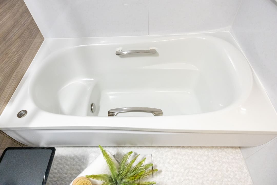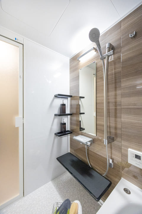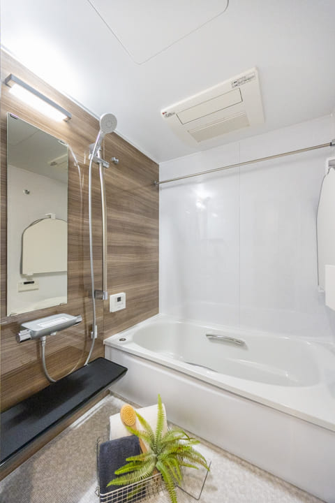 木目柄のアクセントパネルが居心地の良い空間を演出するバスルーム。浴室換気乾燥暖房機や追い焚き機能に加え、ミストサウナも搭載されていて、日々の疲れを心地よく癒せます。発汗によるリフレッシュや、ゆったりとしたボディケアタイムなど、暮らしに寄り添う快適なバスタイムをお楽しみいただけます。