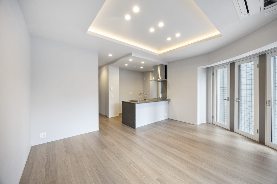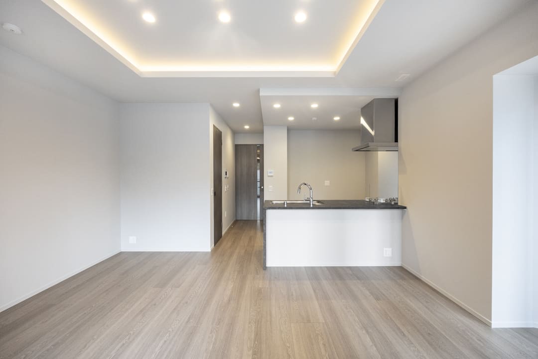 約13.7帖のリビングダイニング。カーブを描く間取りと連続する大きな開口部が、空間にやわらかな広がりをもたらします。折り上げ天井やビルトインエアコンが視線の抜けを生み、さらなる奥行きを演出。間接照明のやわらかな光が空間を穏やかに包み込み、心安らぐひとときへと導きます。