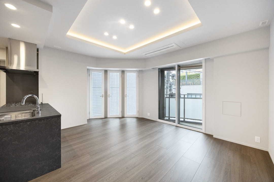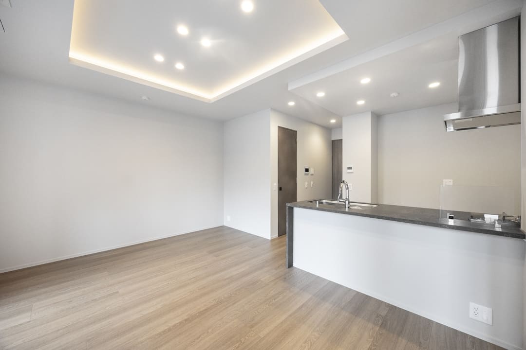 2025年7月に竣工した「プラウド渋谷東」。野村不動産(株)旧分譲の地上9階建レジデンスです。「渋谷」駅より徒歩9分、恵比寿・代官山も生活圏とする渋谷区東二丁目に位置し、都心の利便性と落ち着きを兼ね備えたロケーションが魅力です。ご紹介するお部屋は新築未入居の角住戸、専有面積70㎡の2LDK。リビングダイニングはカーブを描くプランと大きな開口部がやわらかな広がりを演出し、折り上げ天井や間接照明が上質な空間を形成します。床暖房&ビルトインエアコン完備で、快適性にも配慮。ゆとりある対面キッチンには、食洗機・ディスポーザー・浄水器一体型水栓を備え、機能性も充実しています。細則はありますが、ペットとともに暮らせる住まいです。