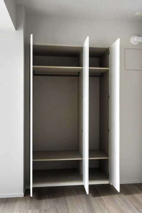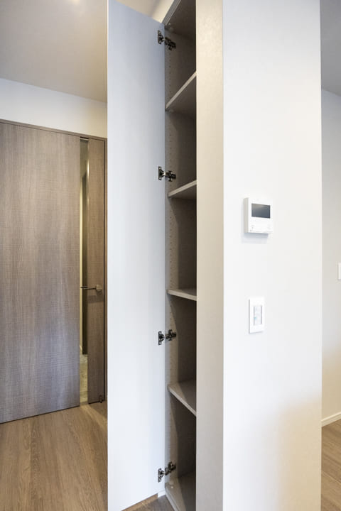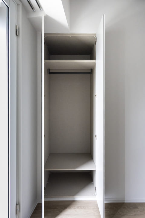 約1.0帖の物入と可動棚を完備。掃除機や季節家電など、高さのある荷物も収納でき、すっきりとした居住空間を実現できそうです。