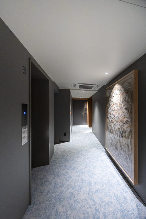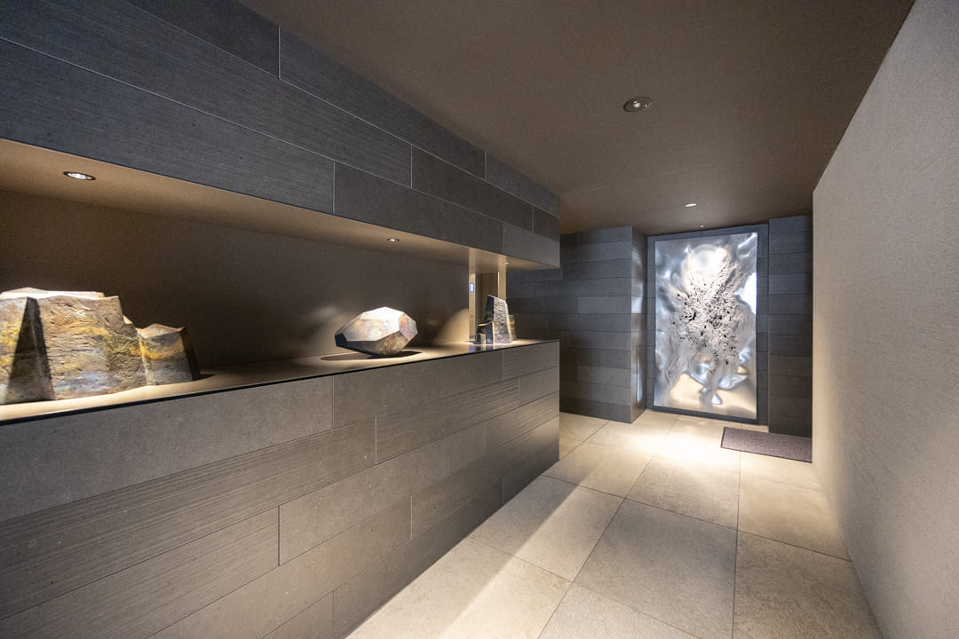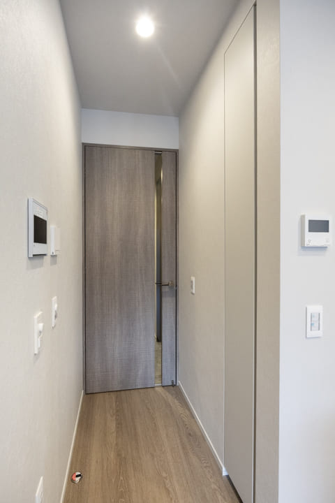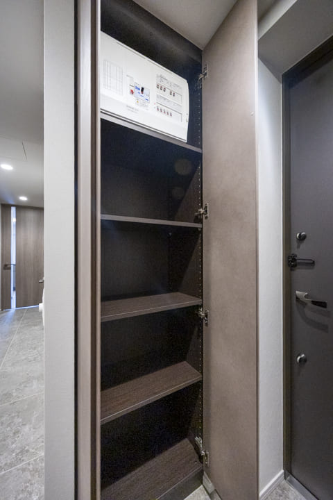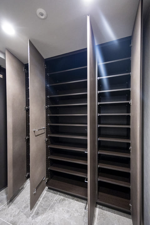 人感センサー付き照明が、帰宅時をやわらかな光で迎える玄関。石柄フロアが高級感を演出します。シューズボックスに加えて2つの可動棚を設け、豊富な収納も魅力。靴はもちろん、ペットグッズや日用品ストックの収納にも重宝しそうです。