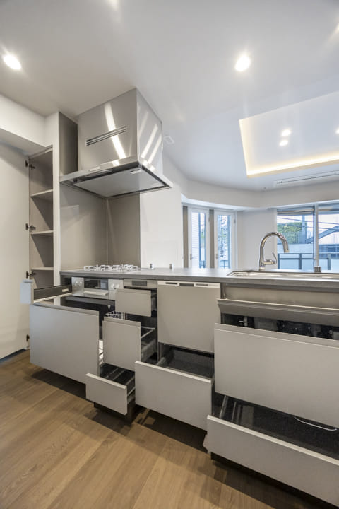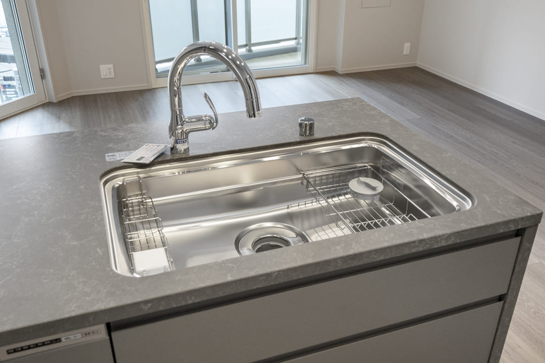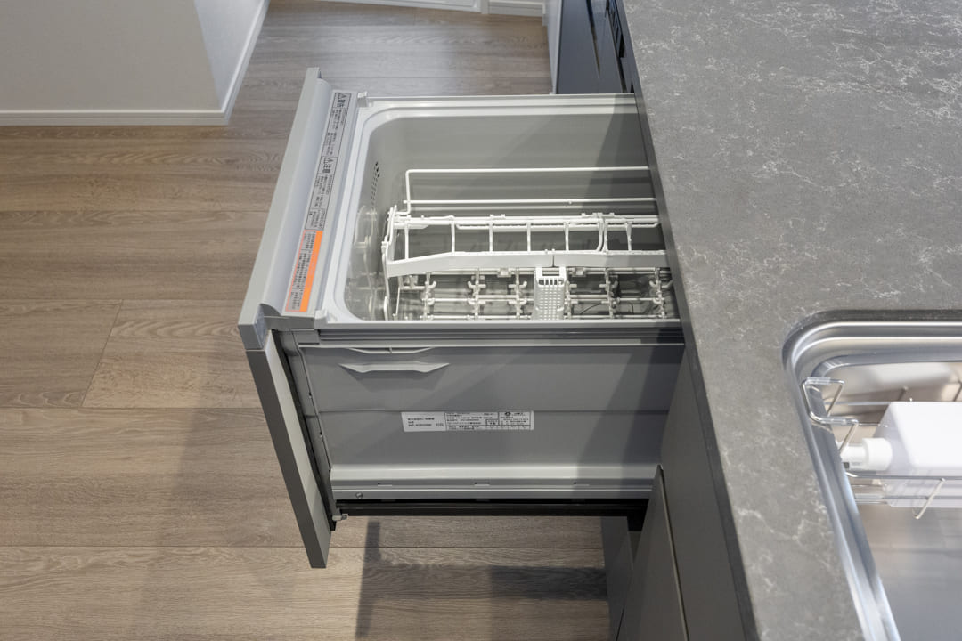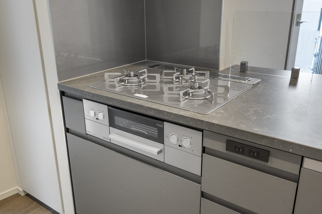 同時調理が叶うグリル付3口ガスコンロ、調理の際に手軽においしい水を使用できる浄水器一体型水栓を完備。さらに、ディスポーザーと食洗機も搭載されています。料理後すぐに生ゴミを処理できるので、悪臭の原因を防ぎ、掃除の手間を軽減。食器洗いも捗り、後片付けの時短が叶います。