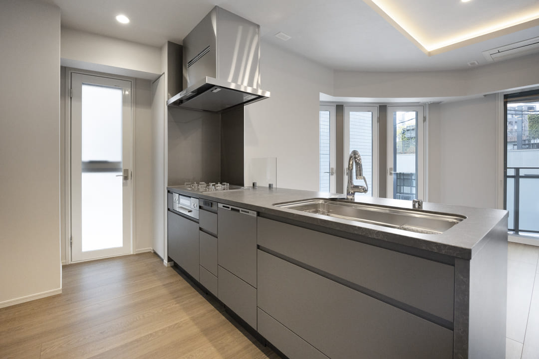約3.8帖のゆとりあるキッチンスペース。グレーを基調とした落ち着きのある色調が、洗練された印象をもたらします。対面式ならではの開放感が広がり、家族との会話を楽しみながら心地よく作業が可能。コンロ側には窓を備え、明るさと自然換気にも配慮されています。