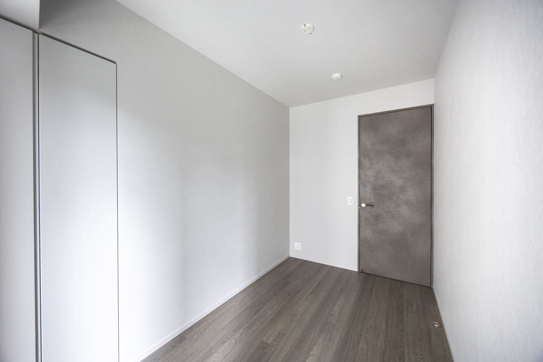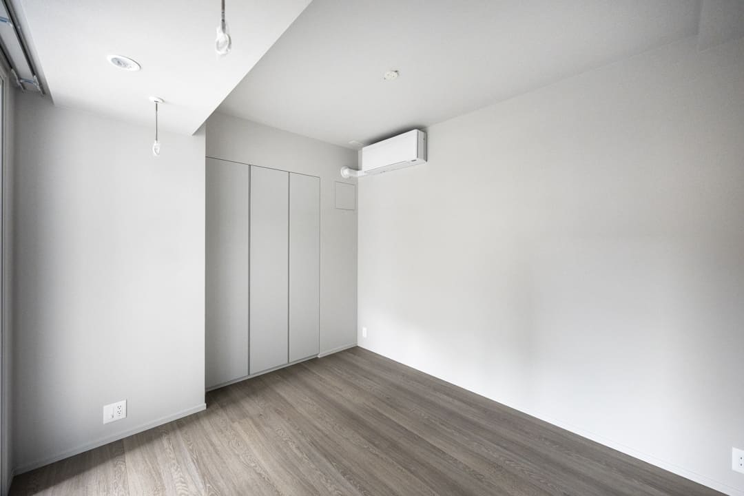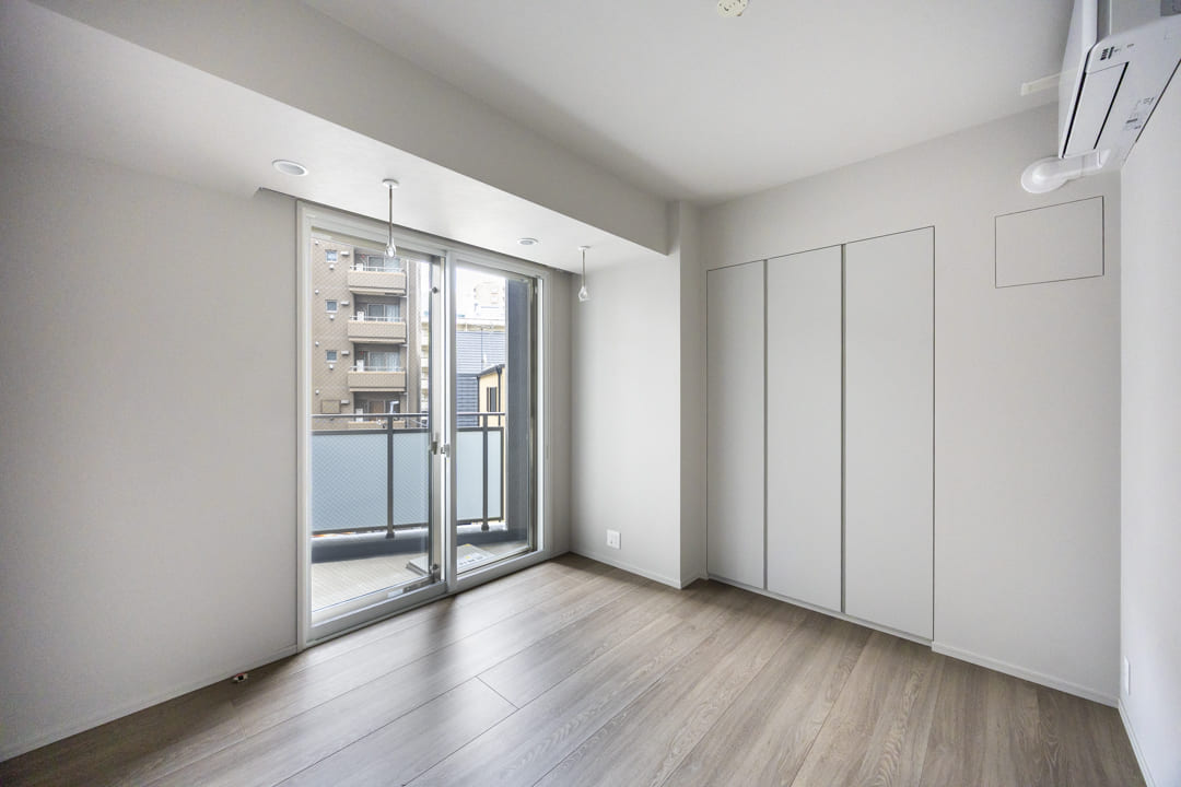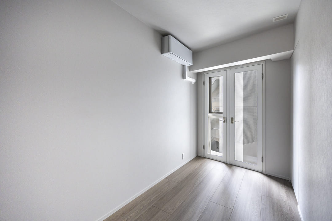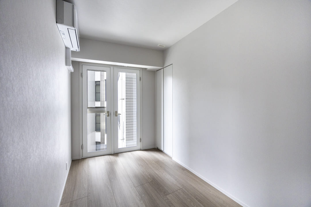 約4.6帖の寝室2。南西向きの窓から明るい自然光が差し込む空間です。シンプルな内装がインテリアの幅を広げ、自由なレイアウトを楽しめます。クローゼットとエアコンを備え、快適性にも配慮されています。