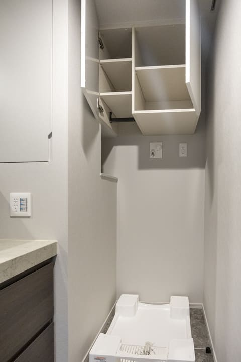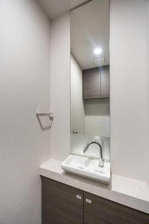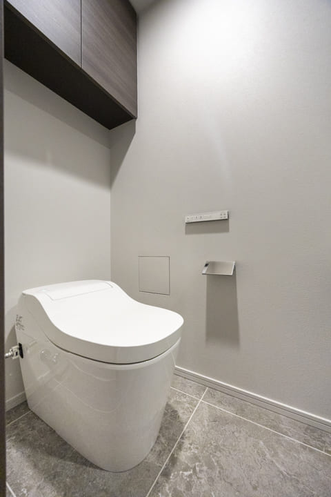 廊下に面していて独立性の高いレストルーム。Panasonic製の洗浄機能付トイレを採用しています。タンクレス仕様でスタイリッシュ。正面には手洗いカウンターを備え、来客時にもスマートにお使いいただける設計です。ミラー付きでさっと身だしなみを整えられるのも嬉しいポイントです。