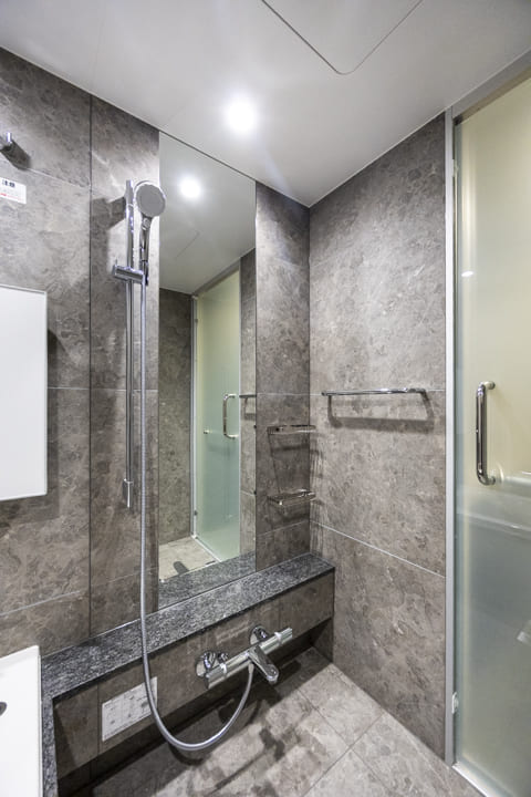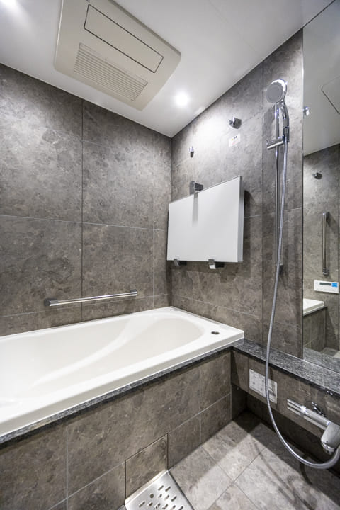 石柄の内装やガラスドアがホテルライクな空間を演出。1418サイズのバスルームです。換気・暖房・乾燥・涼風機能付きで、1年を通して快適なバスタイムをサポート。雨天時の洗濯乾燥や湿気対策にも役立ちます。追い焚き機能も備えており、入浴時間がずれた際や半身浴を楽しみたい時にも便利です。