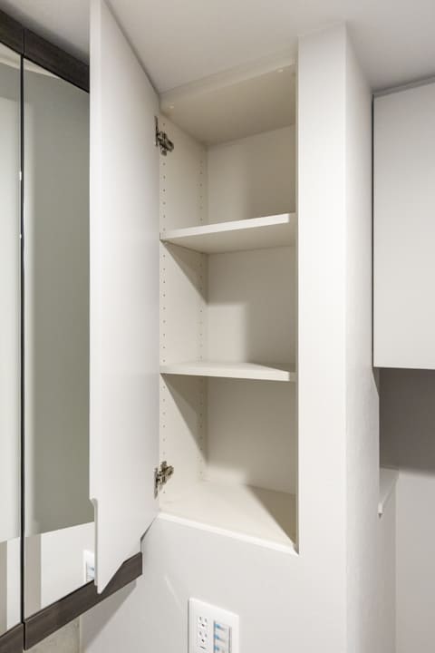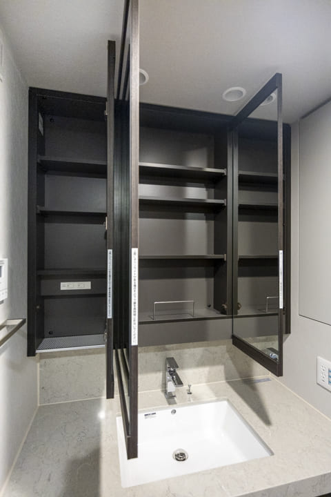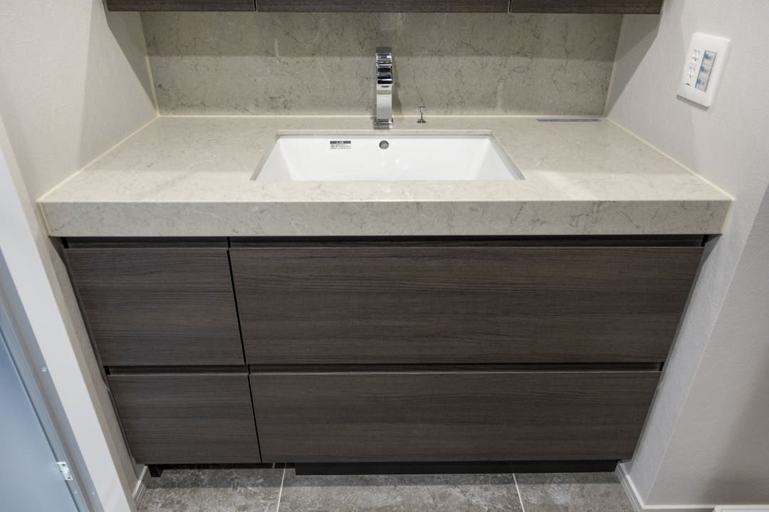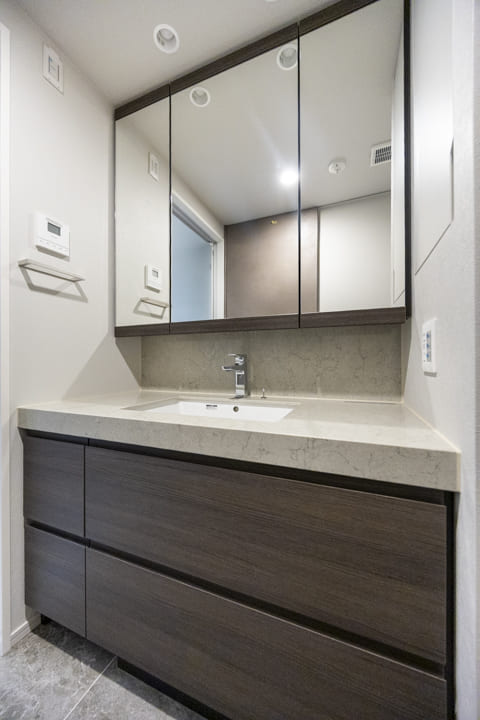 石目調カウンターが上質な雰囲気を演出する洗面化粧台。カウンターには化粧品やヘアケア用品をゆったりと並べることができ、落ち着いて身支度ができます。ミラーボックスに洗面まわりの小物を収納でき、いつも清潔な洗面室をキープできそうです。