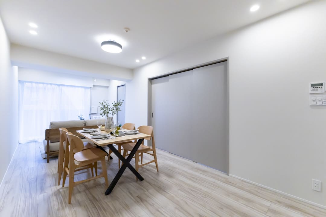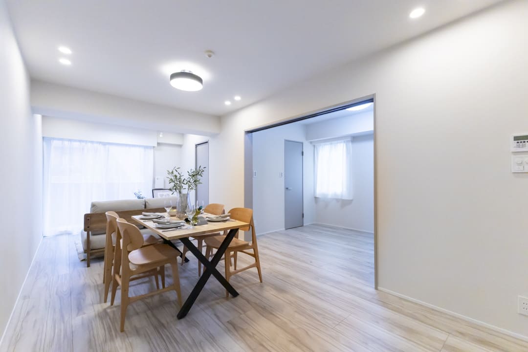 隣接する洋室との間仕切り戸を開放すれば、約18.3帖のゆとりある一体空間に。シーンに応じて広さを調整でき、ゲストを迎える際にも重宝します。