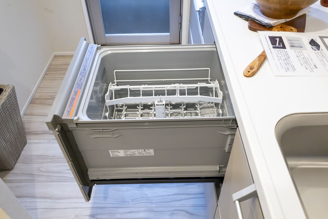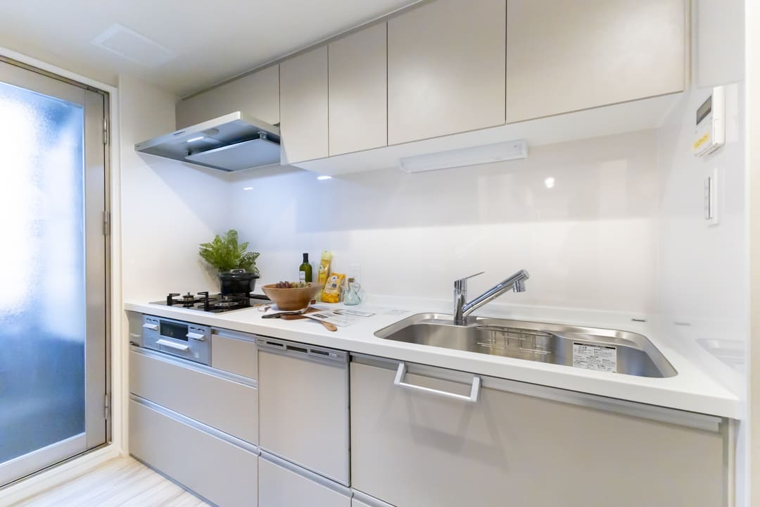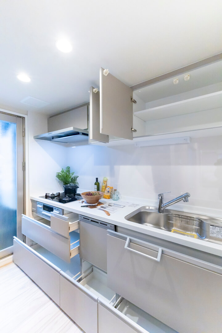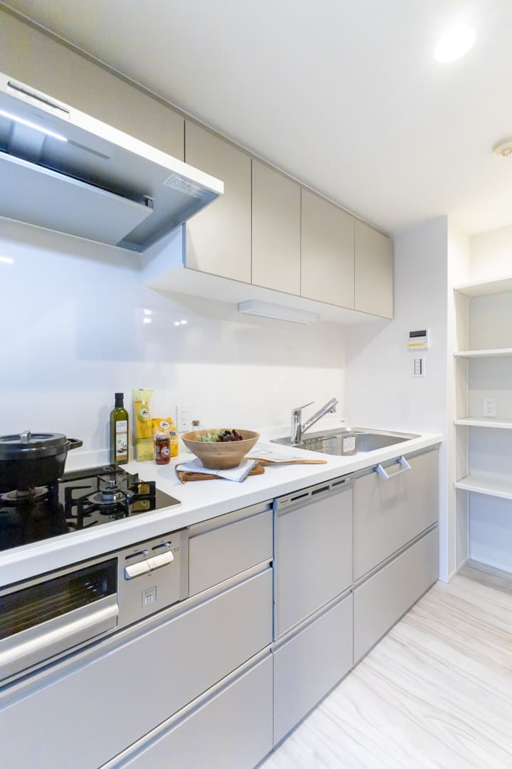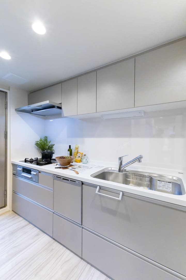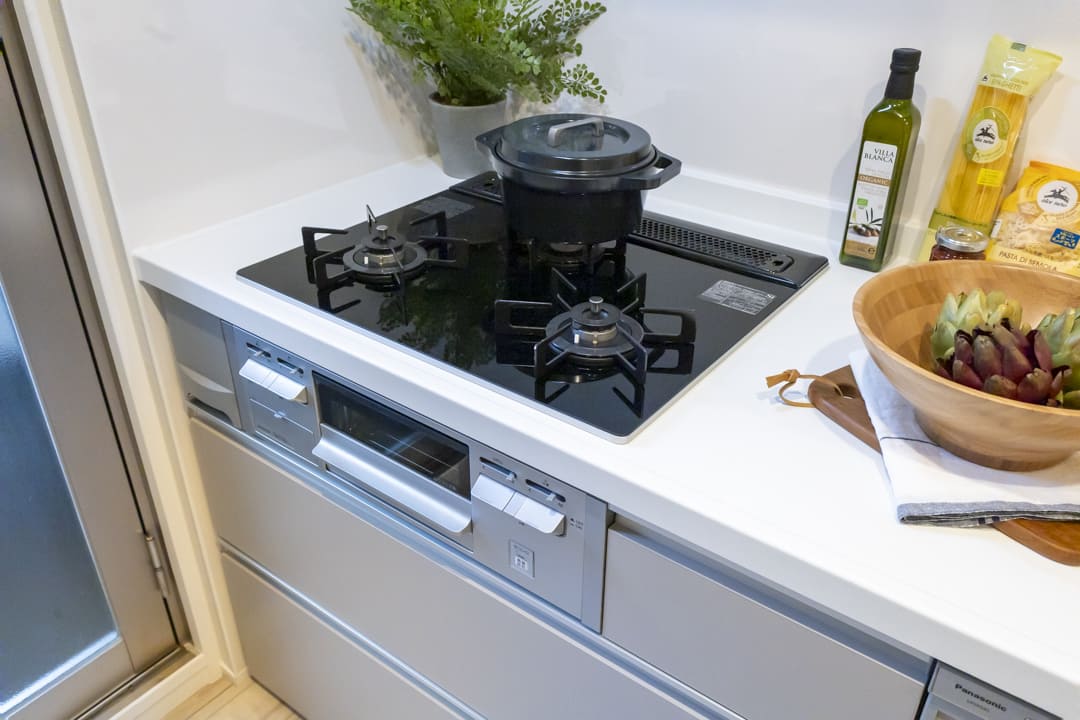調理の際に手軽においしい水を使用できる浄水器一体型水栓や、同時調理の叶うグリル付3口ガスコンロを完備。食洗機も内蔵されていて、後片付けが捗ります。設備が充実していて快適なキッチン時間になりそうですね。