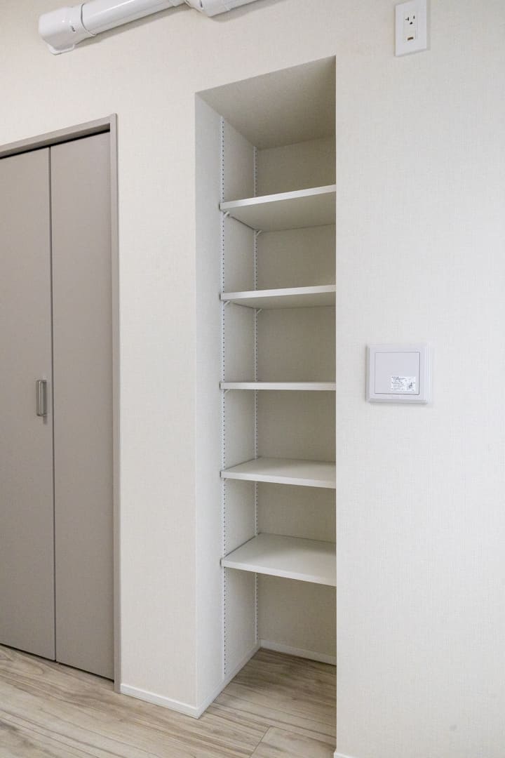調理に集中できる独立キッチン。生活感が出やすいキッチンまわりをさりげなく目隠しでき、調理中のにおいが生活スペースに広がりにくいです。シンク側には可動棚を設け、収納性の高さも魅力。食料品ストックや食器類をたっぷり収納できます。