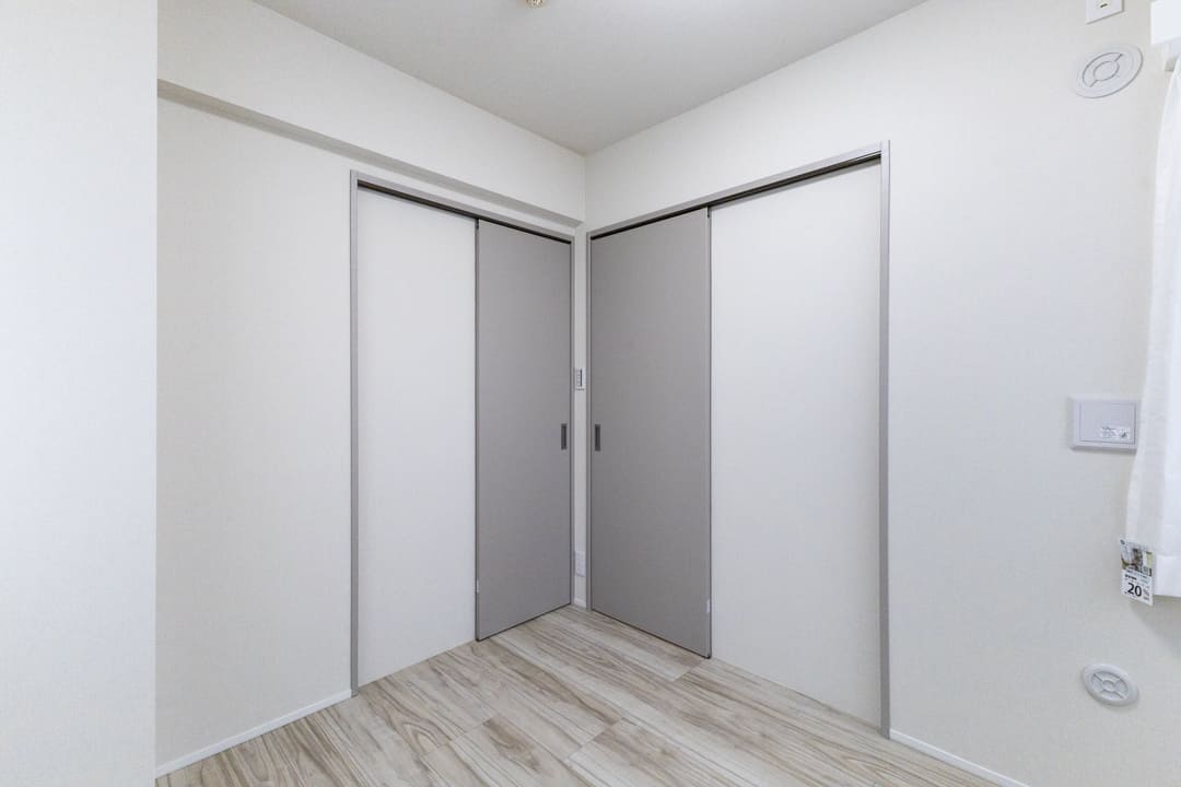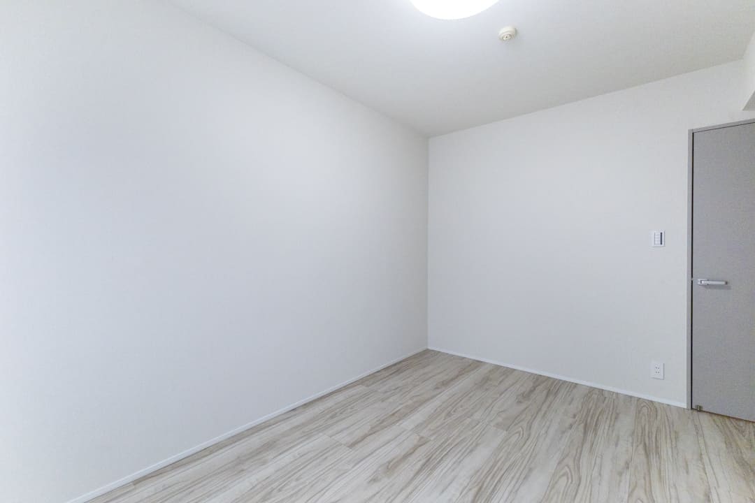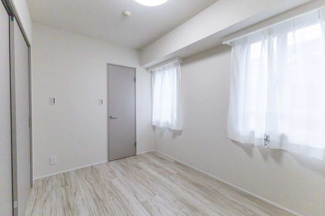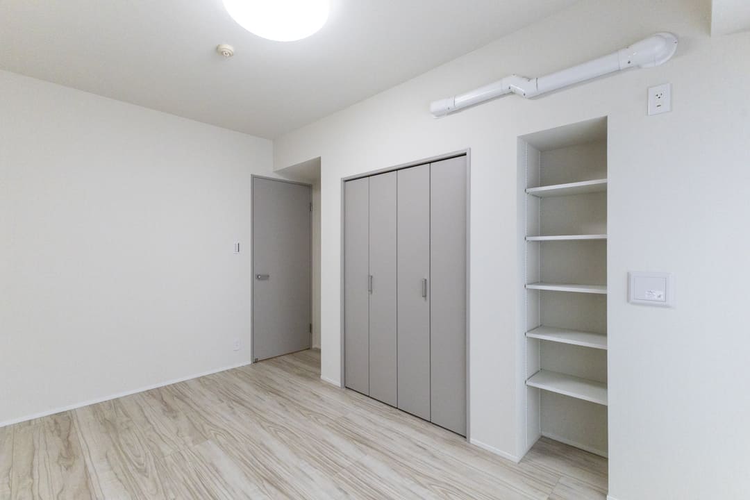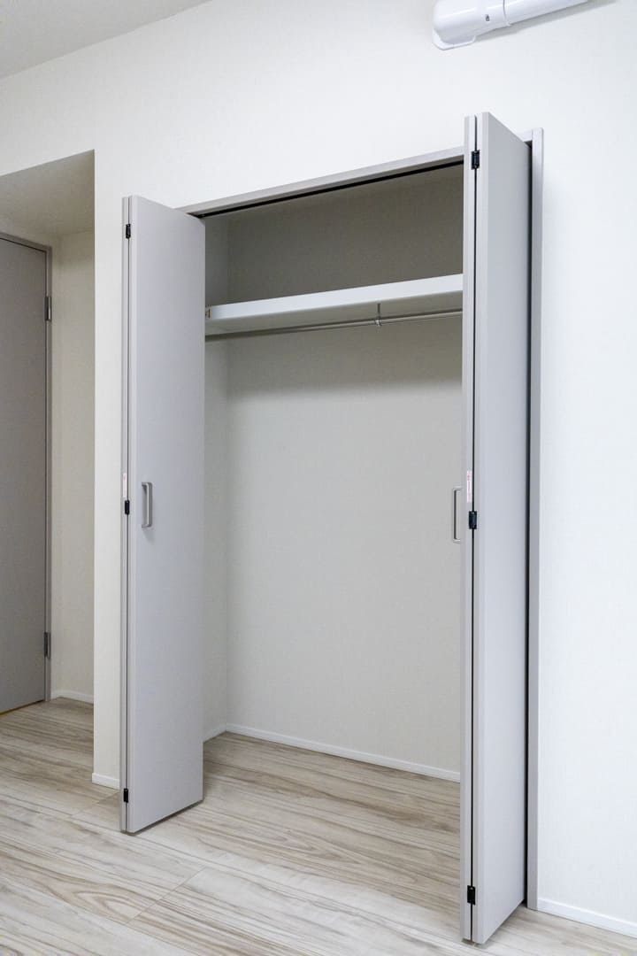約6.5帖の洋室1。独立性が高く、落ち着いて過ごせる一室です。大きな窓からやわらかな光が差し込み、心地よい時間が流れます。クローゼットと可動棚を備え、見せる収納と隠す収納を使い分けられる点も魅力。主寝室としておすすめです。