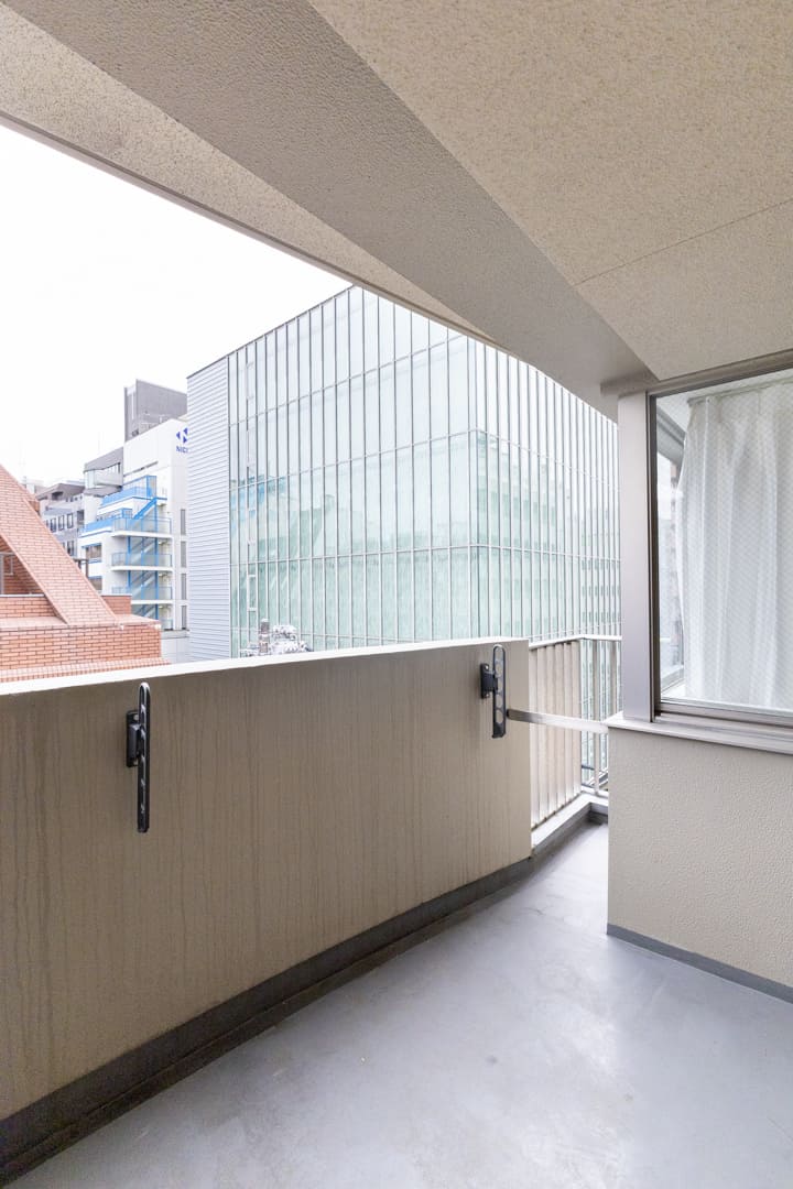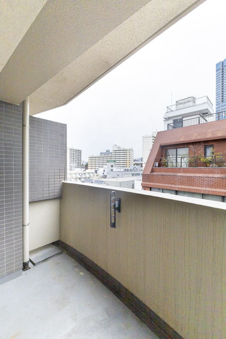LDKに面するバルコニー。撮影日はあいにくの天候でしたが、南向きのため、晴れの日にはあたたかい自然光が届きそうです。物干し金物が備え付けられているのも嬉しいポイントです。