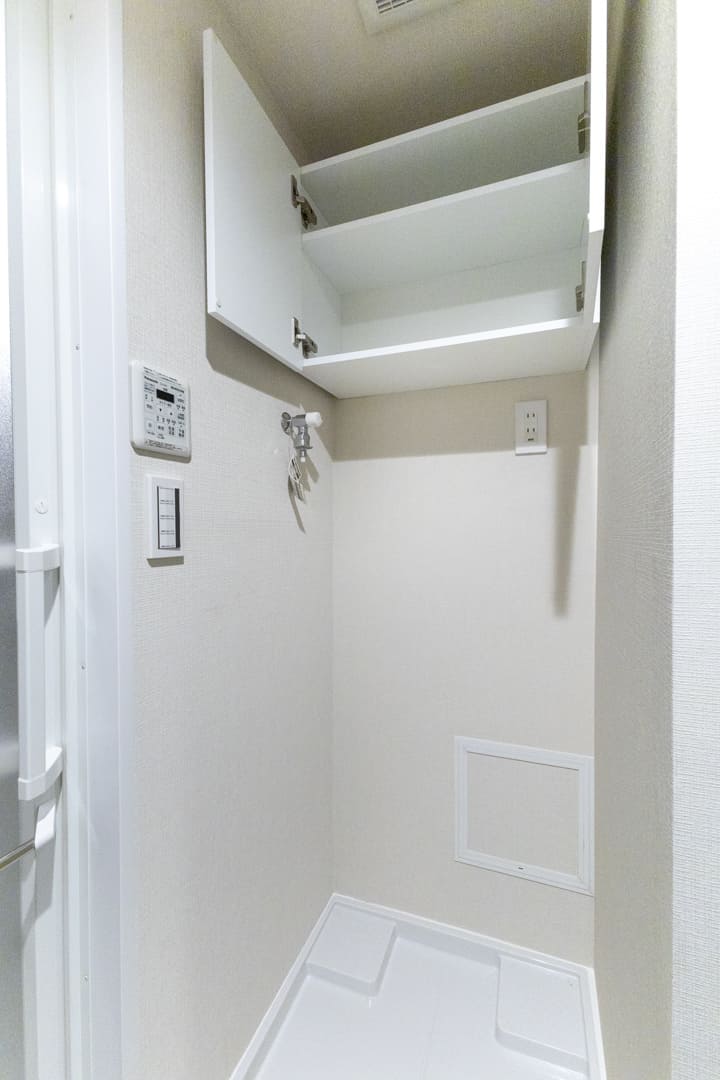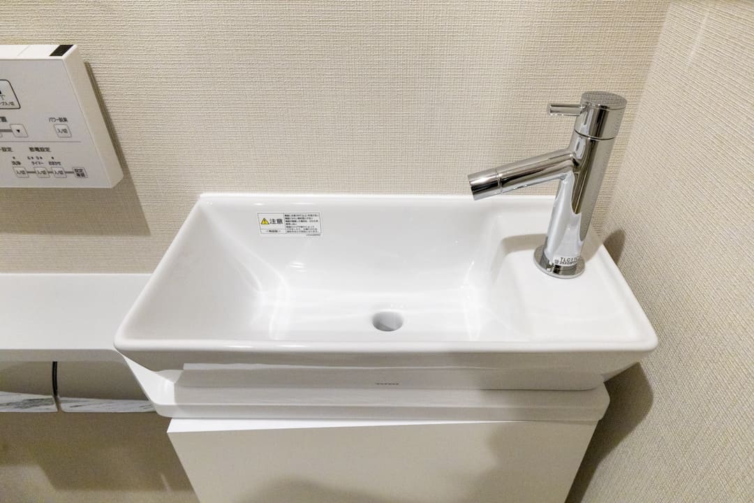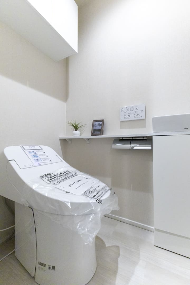 廊下に面していて独立性の高いレストルーム。白基調で清潔感のある空間です。温水洗浄便座付きのタンクレストイレに交換済み。手洗いカウンターを備えており、使用後すぐに手を洗えるのもポイントです。洗面室まで案内する手間が省け、来客時にも配慮された設計となっています。