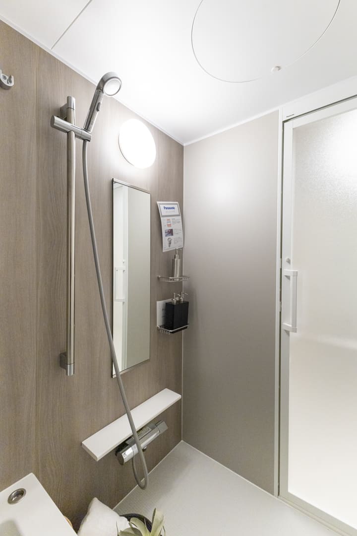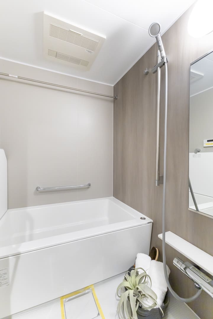 木目柄パネルがアクセントになり、落ち着いた雰囲気のバスルーム。換気・暖房・乾燥・涼風機能を備え、季節を問わず快適なバスタイムをお楽しみいただけます。保温浴槽を採用していて、お湯のあたたかさが長く続くのもポイント。追い焚き機能も搭載されているため、ご家族の入浴時間がずれた際や半身浴を楽しみたい時に便利です。