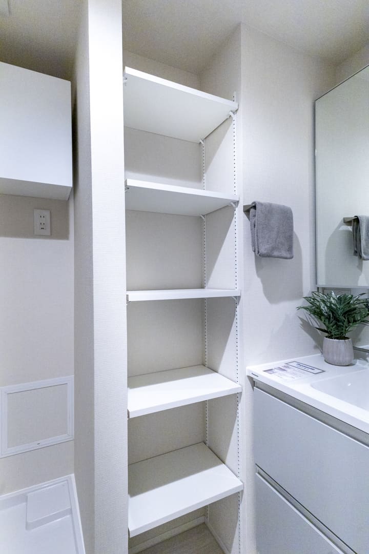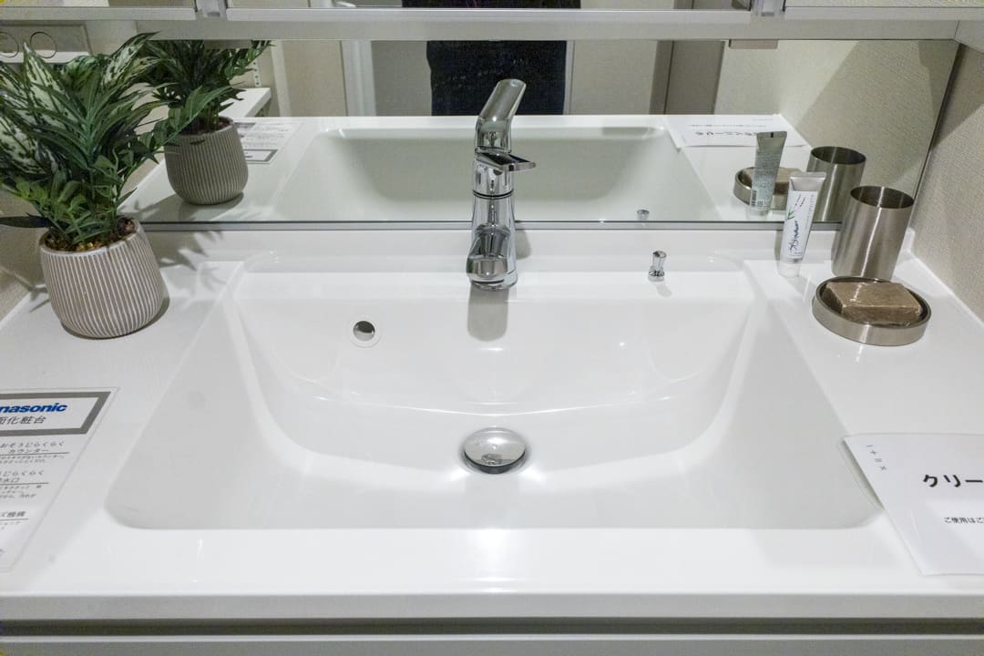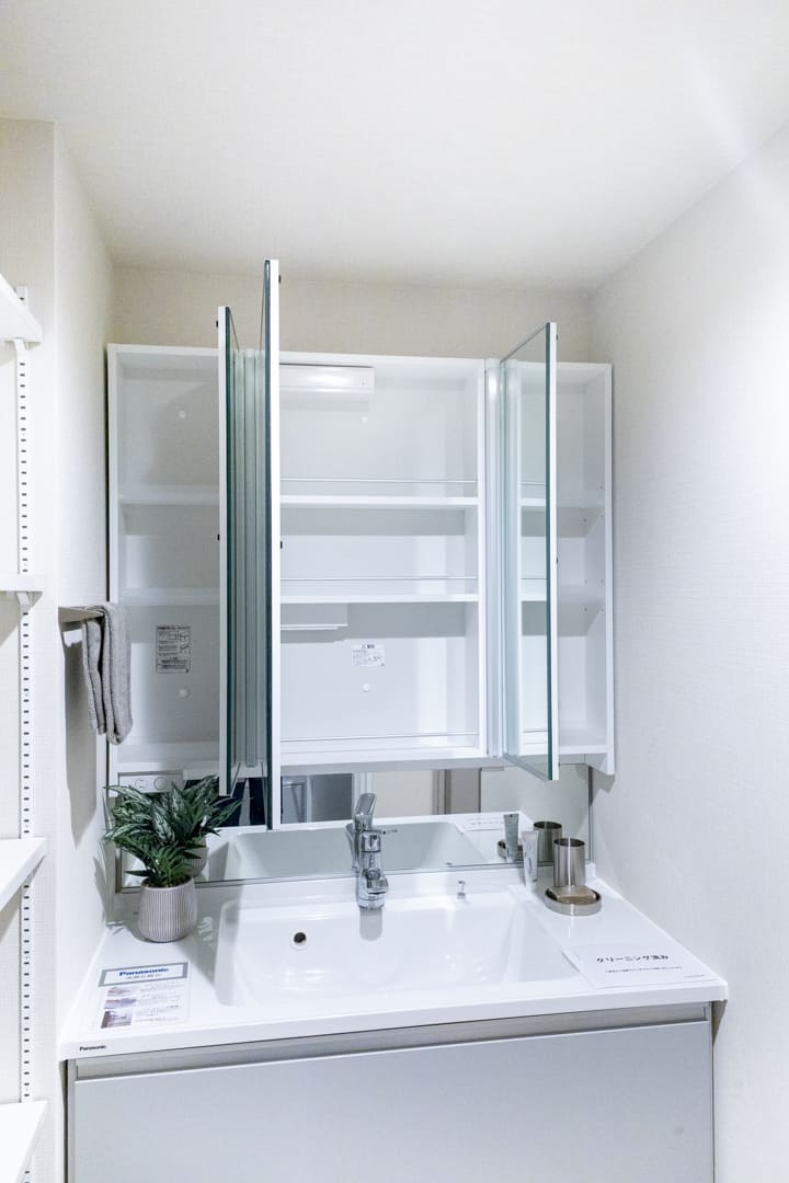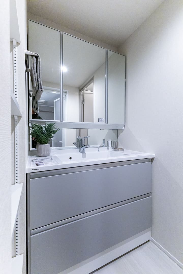 グレー基調で洗練された印象の洗面化粧台。大きな三面鏡&ミドルミラー付きで身だしなみを整えるのに便利です。大開口の洗面ボウルはカウンターと一体成型。汚れが溜まりづらく、お手入れしやすいのが嬉しいポイントです。洗面台本体の収納に加え、可動棚が備わっていて収納性の高さも魅力です。