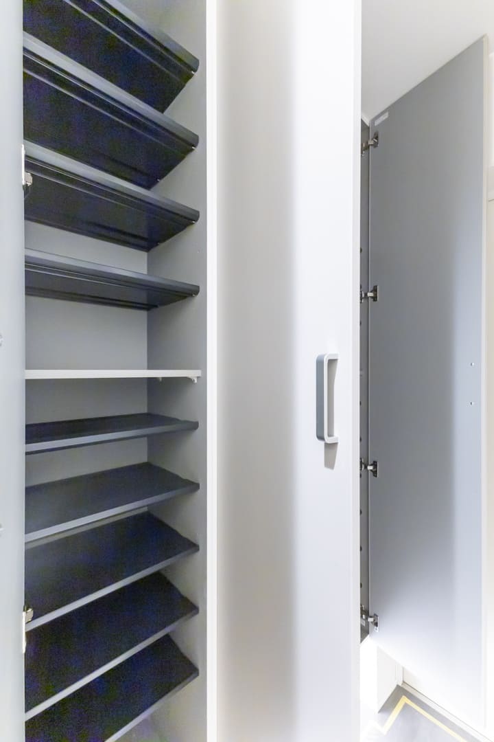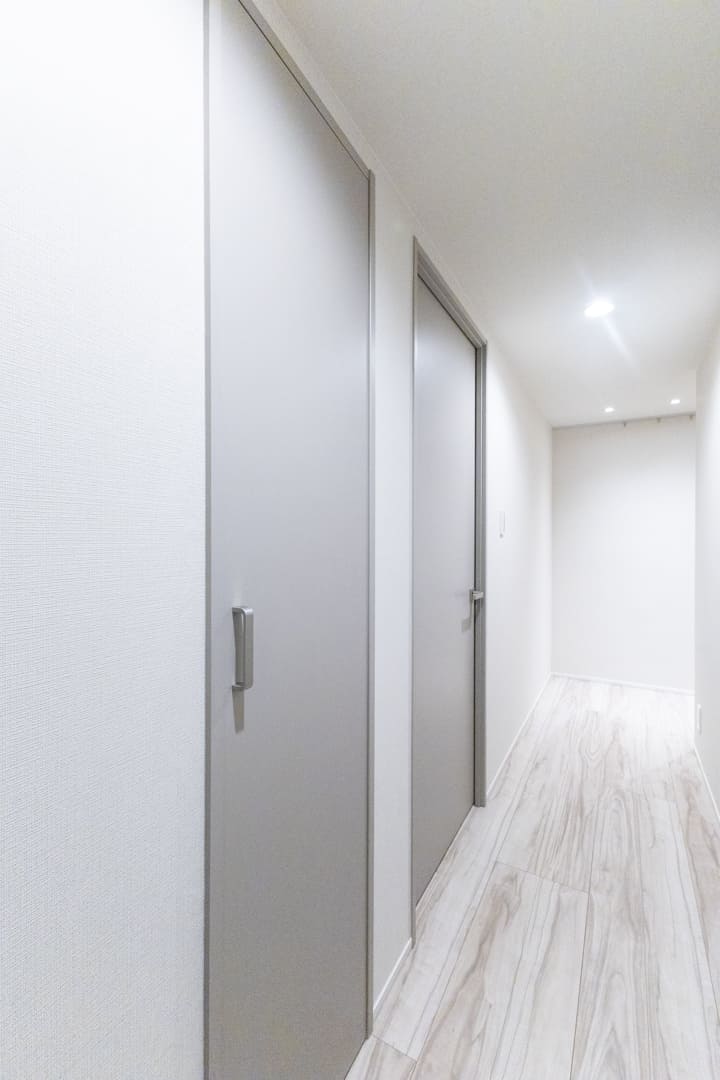 フットライトが足元をやさしく照らす玄関。フロートタイプのシューズボックスを備え、靴をすっきり収納できます。全身鏡付きで、お出かけ前の身だしなみチェックにも便利です。廊下には収納を設けており、日用品のストックや掃除道具の収納に重宝します。ピクチャーレールを活用して、アートや写真を飾れるのも魅力です。