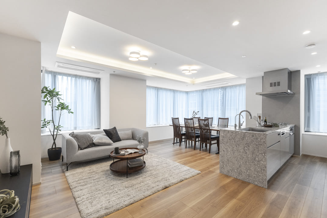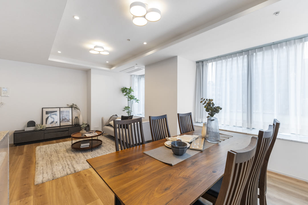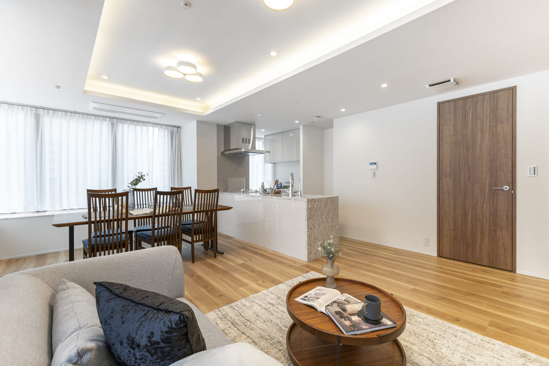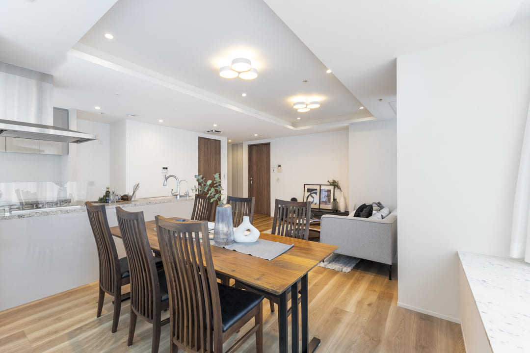 南東二面採光により、心地よい自然光がたっぷりと降り注ぐリビングダイニング。キッチンスペースを含めて約24.2帖のゆとりある広さを確保しています。ご家族での時間はもちろん、ゲストを招いた際にもゆったりとお過ごしいただけます。
