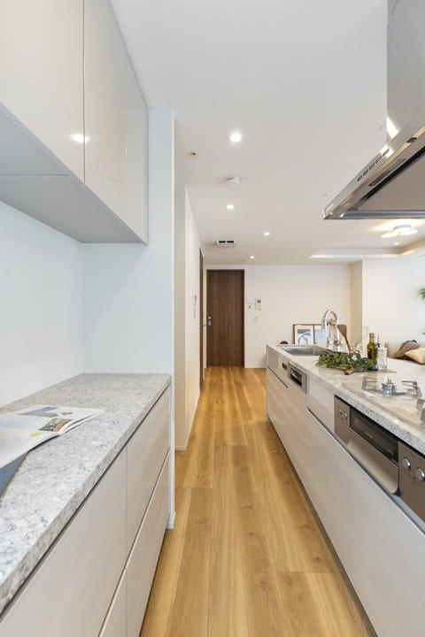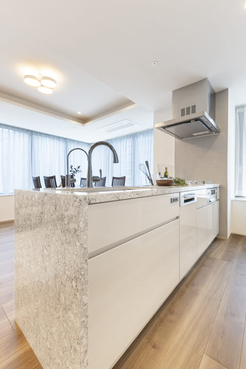 リビングダイニングを見渡せる対面キッチン。窓に囲まれ、開放感のある中で調理ができます。家族のコミュニケーションも増えそうですね。コンロ前には油跳ねガードを設置し、使い勝手にも配慮。ホワイトの面材と石目調カウンターが調和した、上質なデザインです。