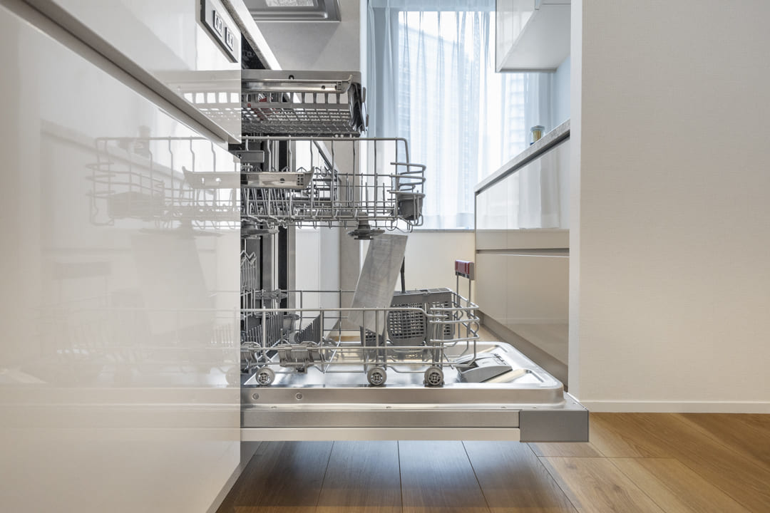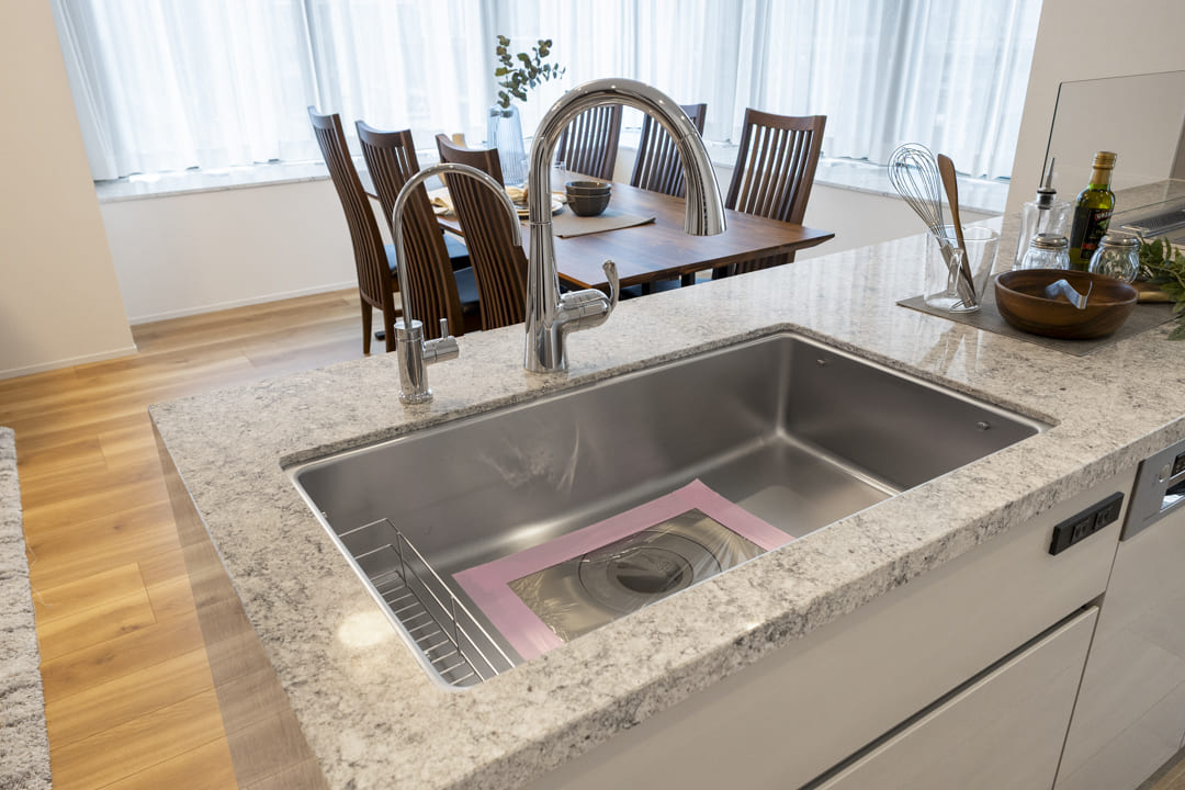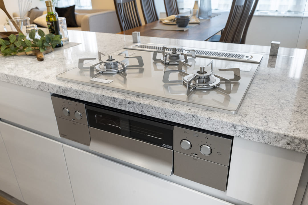 グリル付3口ガスコンロを備え、同時調理に対応。さらにディスポーザーとBOSCH製の食洗機を搭載しています。生ゴミをすぐに処理でき、においの発生を抑えながら手間を軽減。食器洗いもスムーズに進み、後片付けの時間短縮につながります。