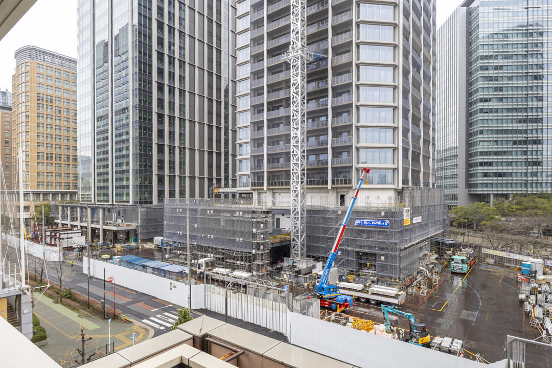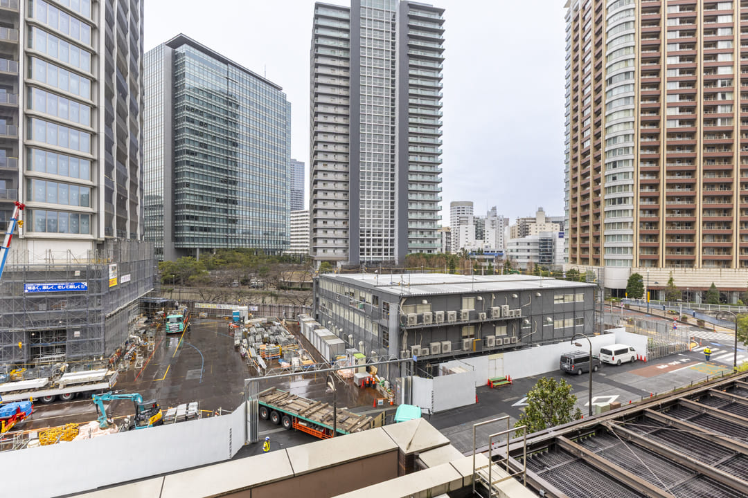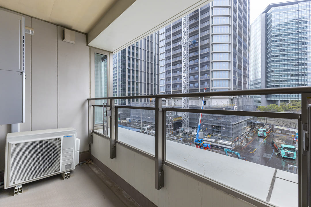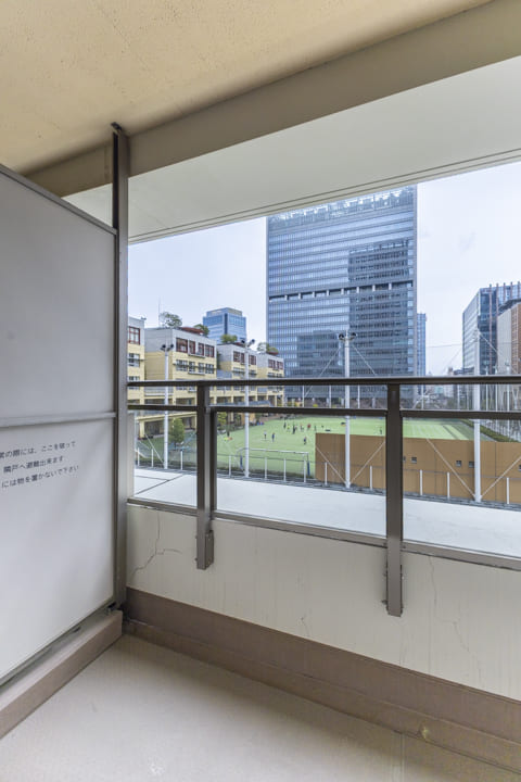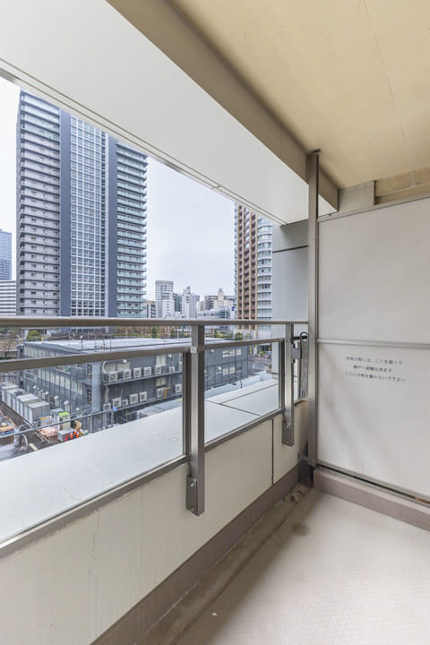 寝室1に面した南向きのバルコニー。撮影日はあいにくの空模様でしたが、晴れた日には心地よい陽光が期待できます。高層マンションが建ち並ぶ都心の景色の奥には目黒川が流れ、都市の中に穏やかな潤いを感じさせます。