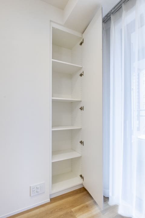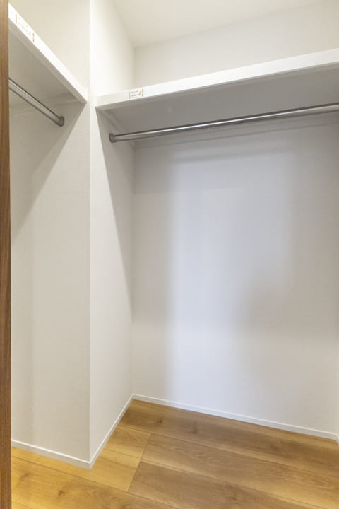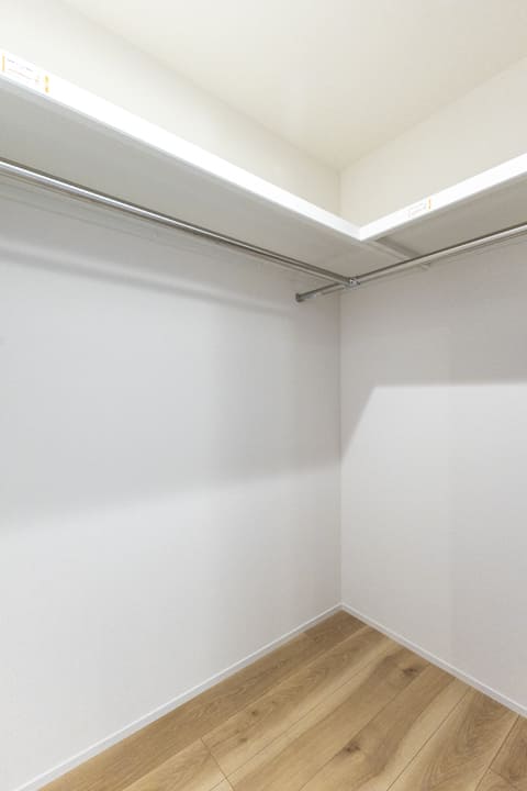 WIC(ウォークインクローゼット)完備で収納力◎。衣類はもちろん、トランクケースやゴルフバッグといった大きな荷物も収納でき、居室空間を有効活用できます。室内には可動棚収納も備わっているため、小物も整頓しやすいです。