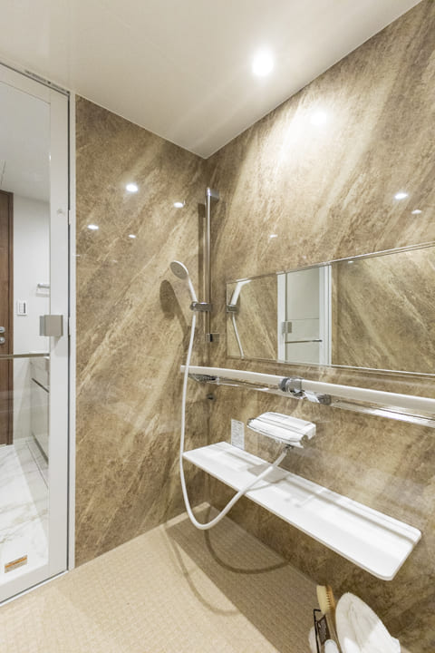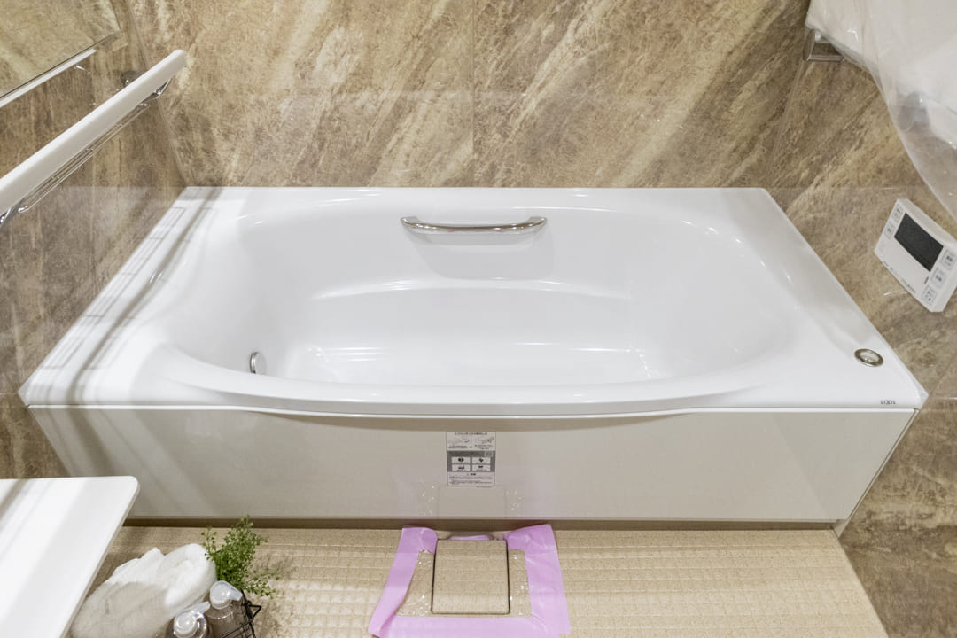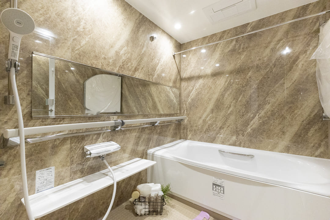 ゆったり入浴できる1620サイズのバスルーム。大理石柄で高級感の漂う空間です。換気・暖房・乾燥・涼風機能付きで1年中快適なバスタイムに。雨天時の洗濯乾燥や湿気対策にも配慮された仕様です。追い焚き機能も備えており、家族の入浴時間がずれた際や半身浴を楽しみたい時にも便利です。
