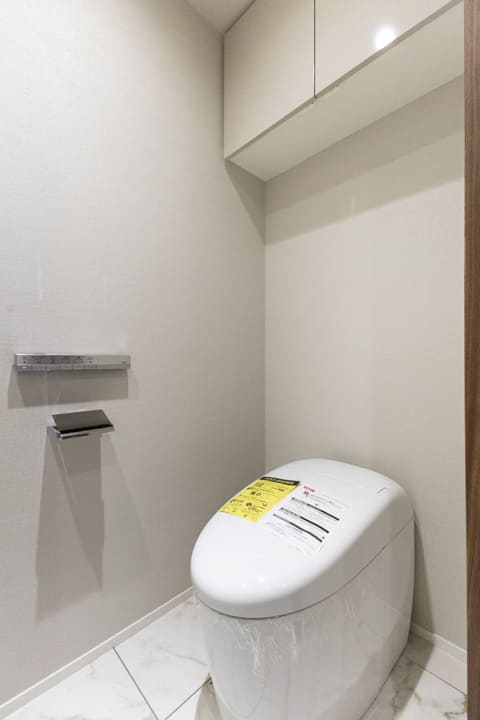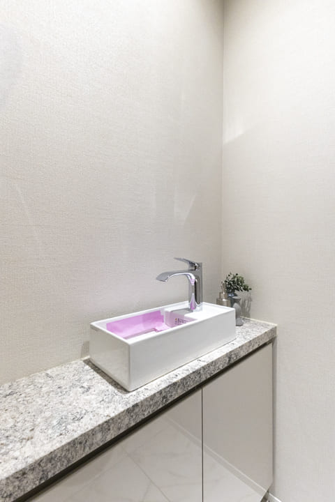 廊下に面していて独立性の高いレストルーム。TOTO製のスタイリッシュなタンクレストイレに交換済みです。手洗いカウンター付きのため、使用後すぐに手を洗うことができ、衛生面にも配慮された設計。ゲストを洗面室まで案内する必要がなく、スマートにお使いいただけるのも嬉しいポイントです。