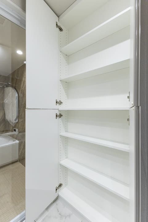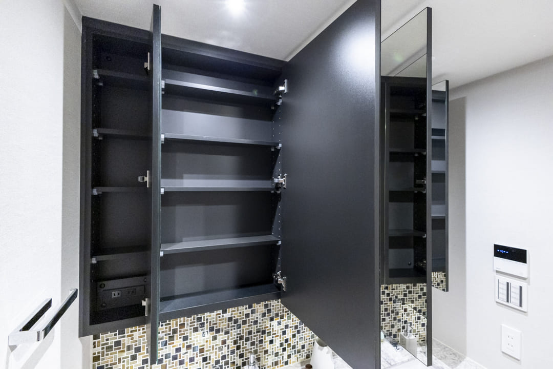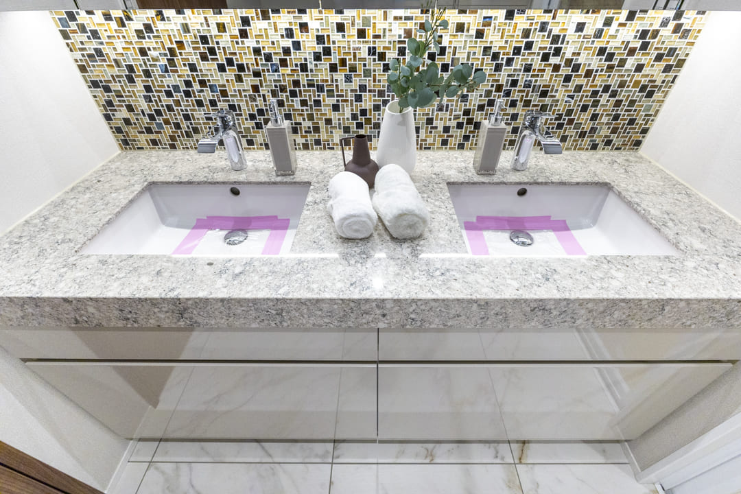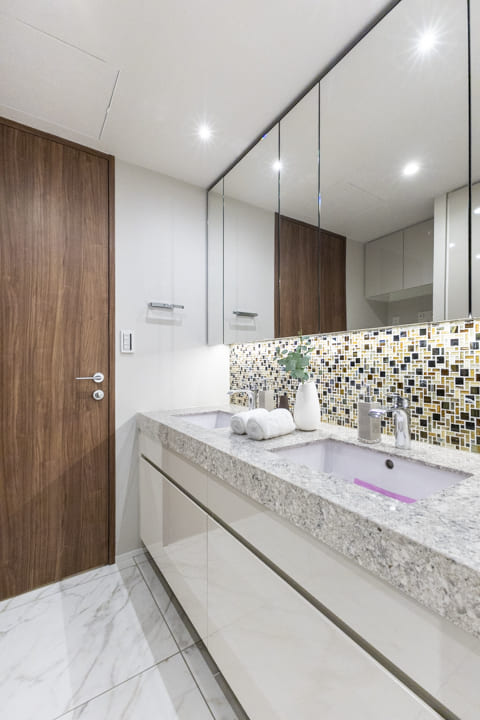 モザイクタイルが印象的でホテルライクな洗面化粧台。2ボウル仕様のため、忙しい朝の身支度にもゆとりが生まれます。ミラーボックスと足元の引き出しに加え、背面にはリネン庫を設置。自由度の高い可動棚で、タオルや小物の収納に便利です。