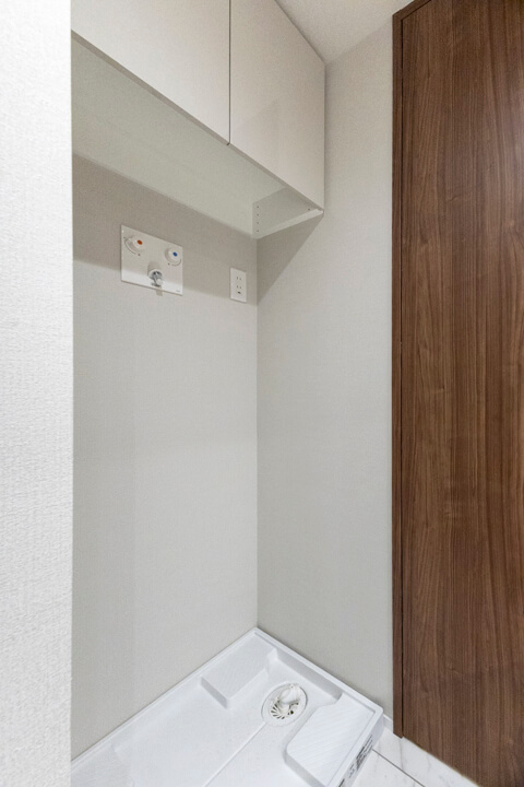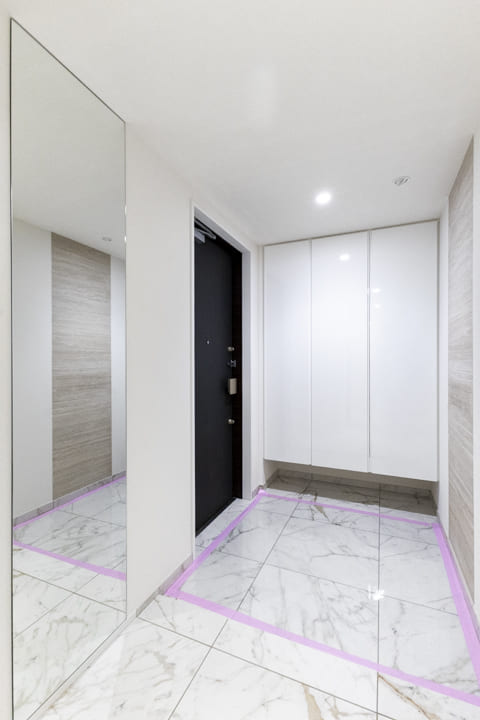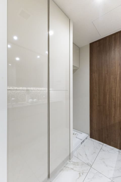 大理石柄のフロアが広がるホテルライクな玄関ホール。さりげないアクセントウォールも印象的です。大容量のシューズボックスを備え、靴や雨具もすっきりと収納可能。全身鏡が奥行きを演出し、空間に広がりをもたらします。