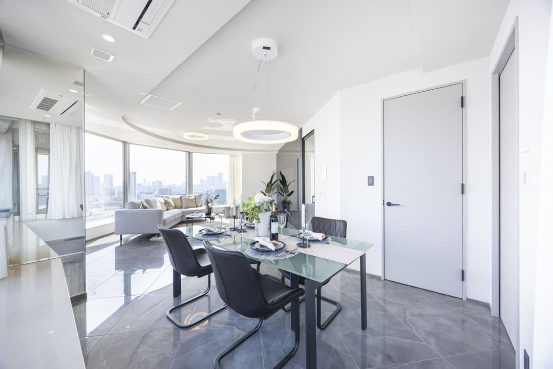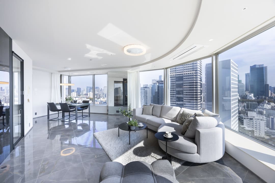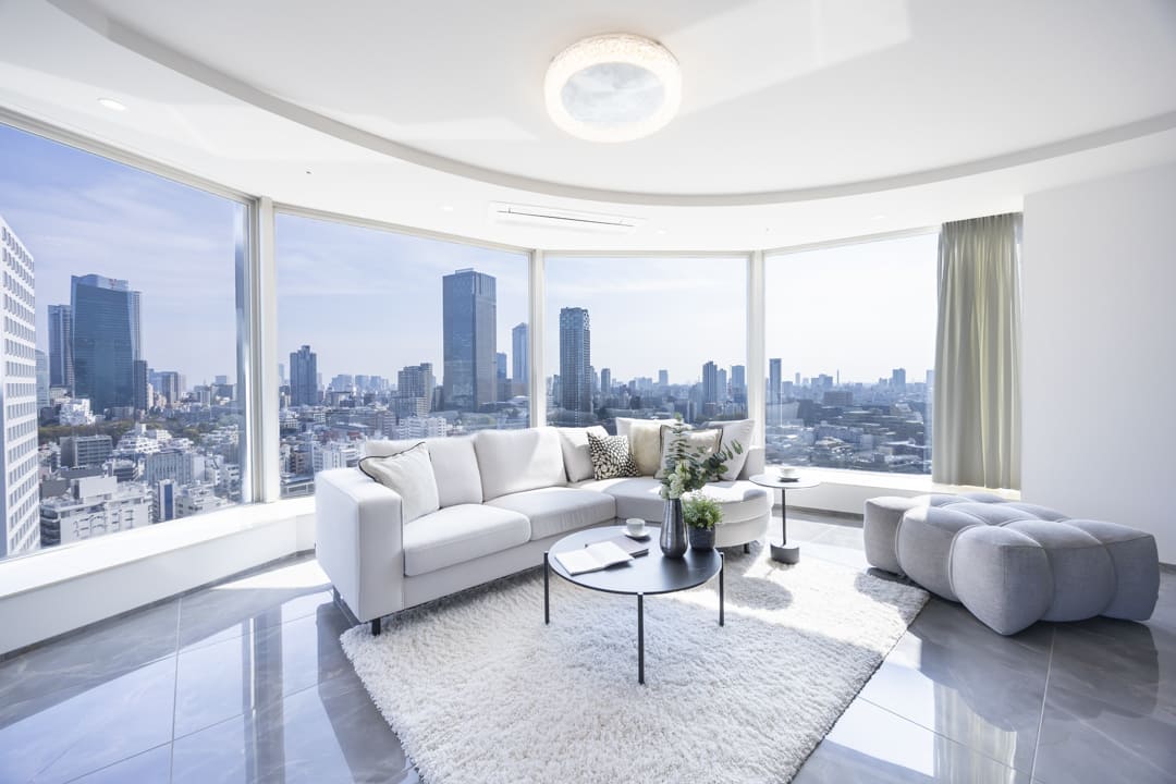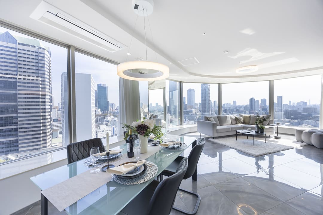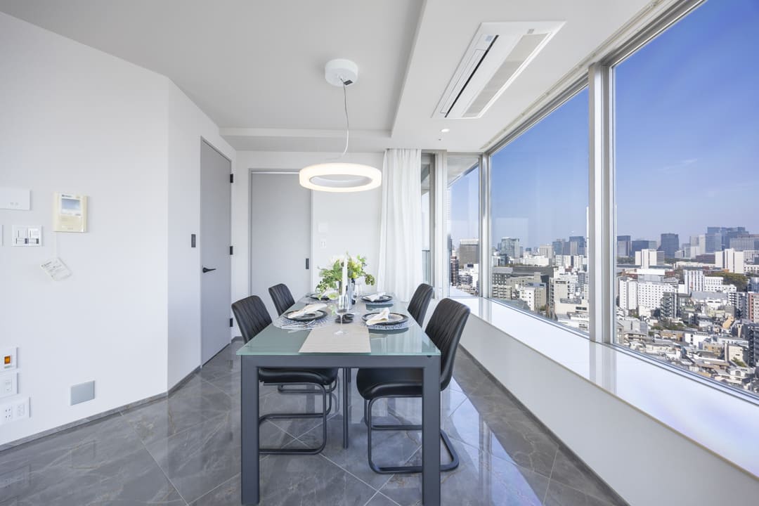 約24.0帖の広々としたリビングダイニングです。大きな窓に囲まれた開放感溢れる空間で、都心の景色をダイナミックに取り込む設計。青山・六本木方面を一望でき、視界を遮るものが少なく、空と街並みが一体となるような抜け感が魅力です。また、エアコンは埋め込み式のためインテリアの邪魔をしないのも嬉しいポイント。収納スペースも造られているので、ストック類などをすっきりと収納できます。