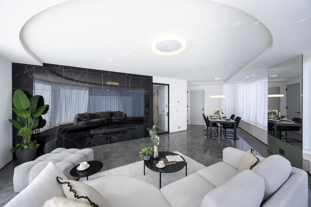 壁面には、W2800×H1280の大判サイズを誇るグラスルーチェ(ビルトインTVモニター)を設置。電源をオフにすると一面のミラーへと切り替わり、空間に奥行きと広がりをもたらします。オンの際には映像が美しく浮かび上がり、まるでアートのようにインテリアの一部として機能。日常のひとときさえも上質に演出し、洗練されたエレガントな空間を際立たせてくれます。