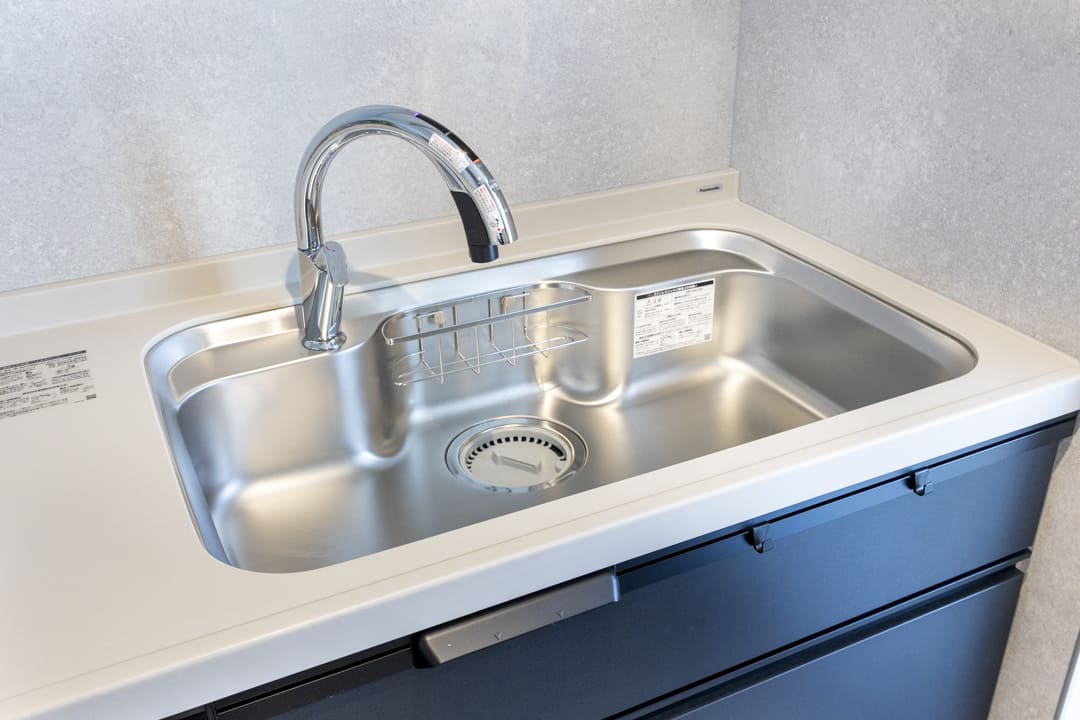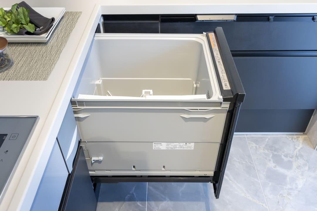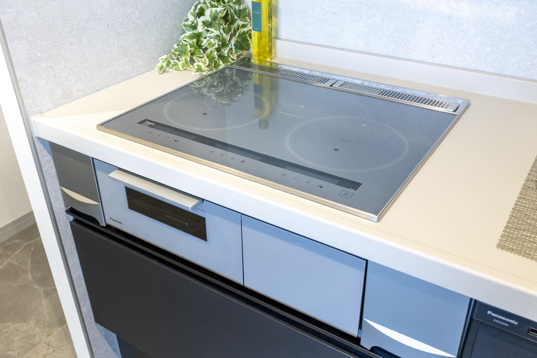 3口IHクッキングヒーター、グリル、ディスポーザー、食洗機付きと設備面も充実しています。作業スペースにはコンセントがあるので、ミキサーなどのキッチン家電が使いやすそうです。