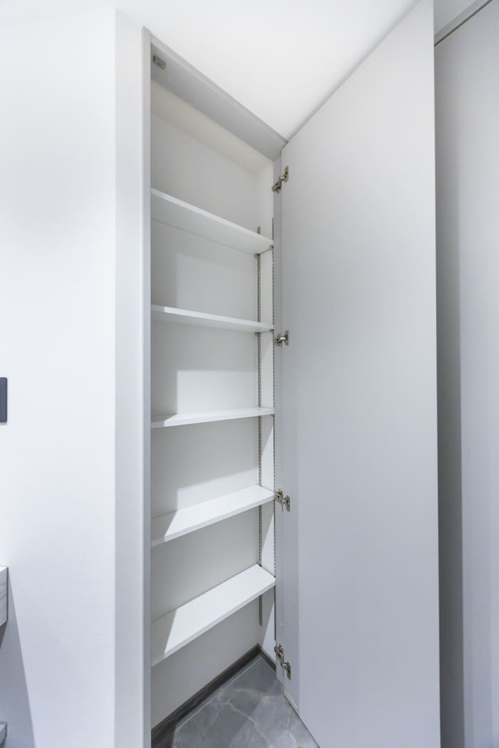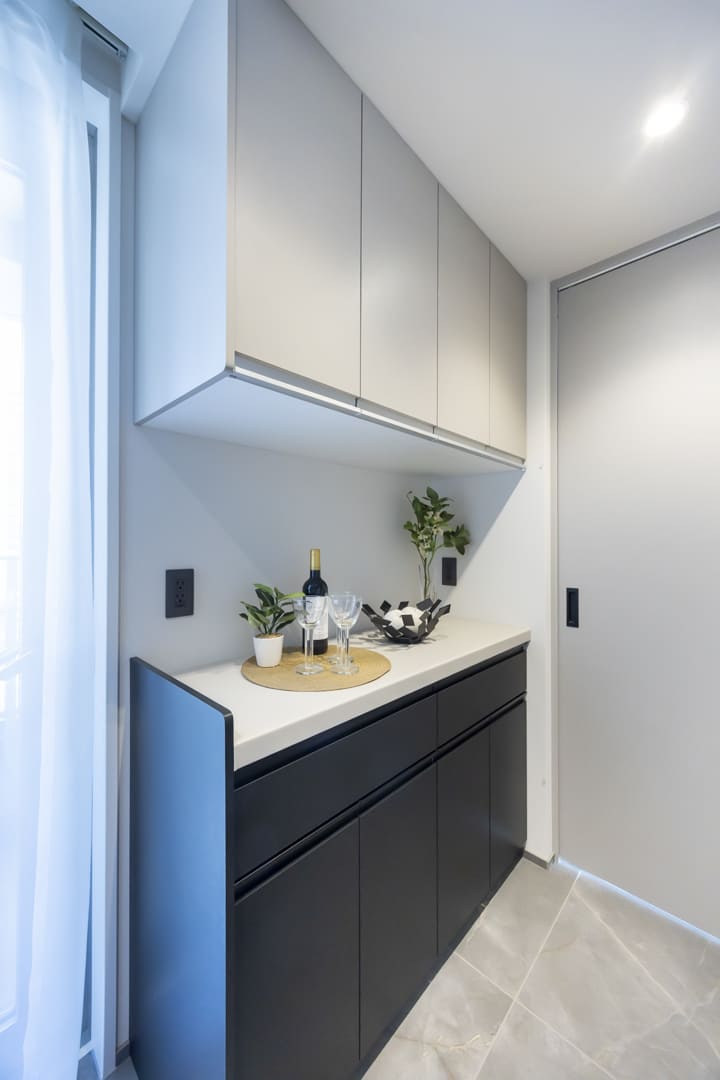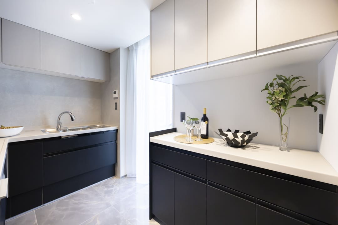 キッチンの背面側にはカップボードが備え付けられています。調味料や食器などを収納できるだけでなく、電子レンジなどを置くこともできるので便利です。