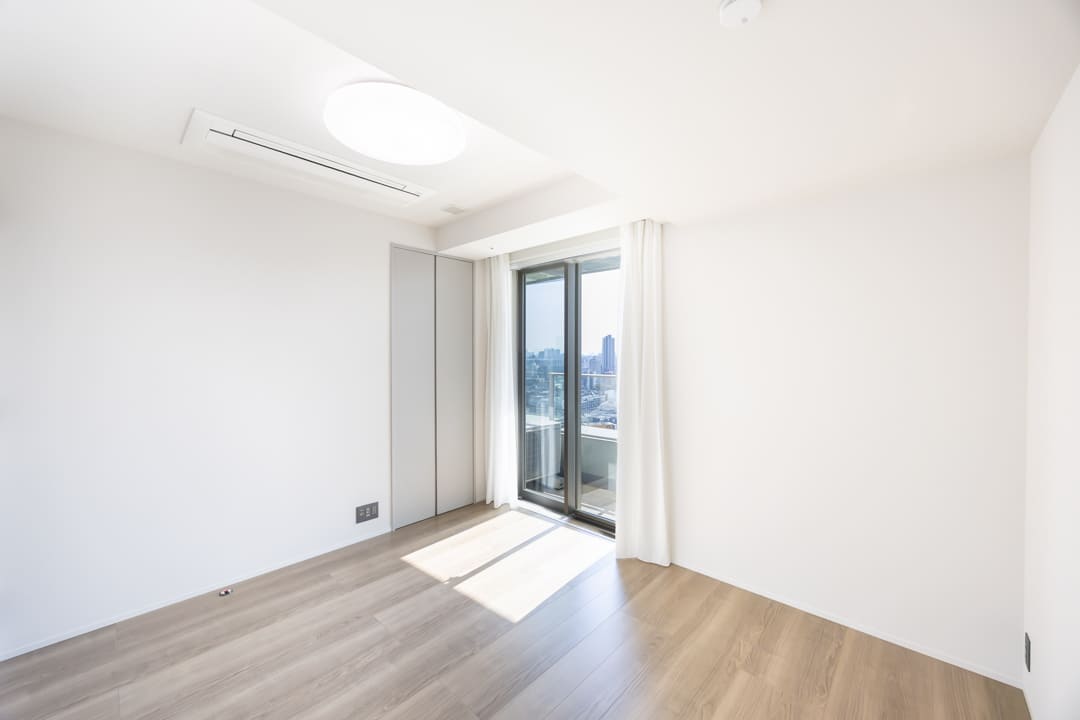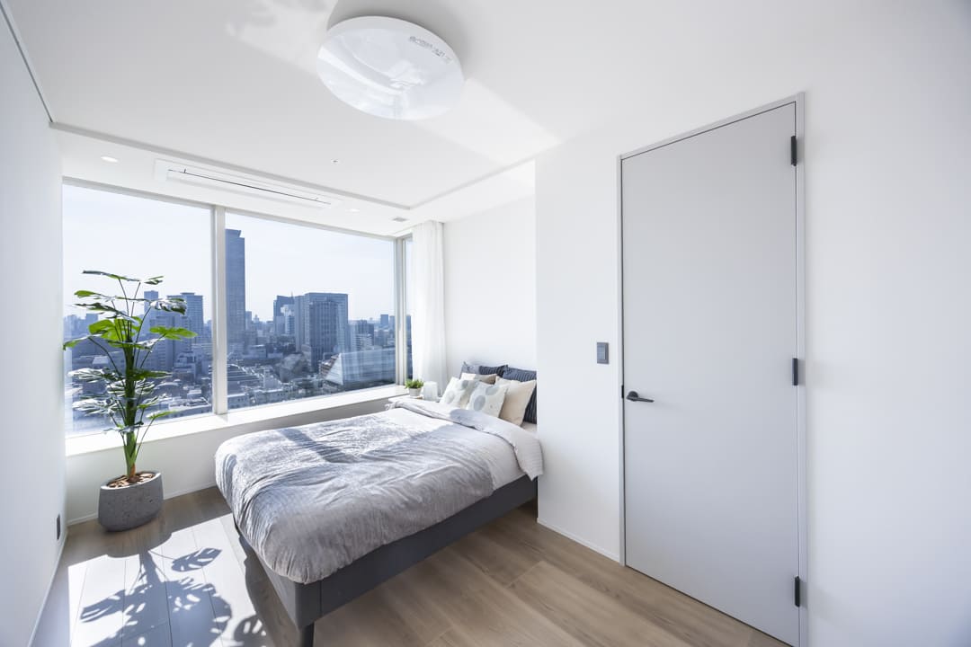 約8.1帖の主寝室は大きな窓が目を引きます。高層階ならではの都会の景色を独り占めできる贅沢さがあり、明るく、朝の目覚めも爽やかそうです。壁面にはピクチャーレールが設置されているので、自分好みに演出できます。また、奥行きがあるウォークインクローゼットが造られているため、洋服や大きめの荷物も収納することができますよ。さらに、インターホンが設置してあり、来客対応も可能です。