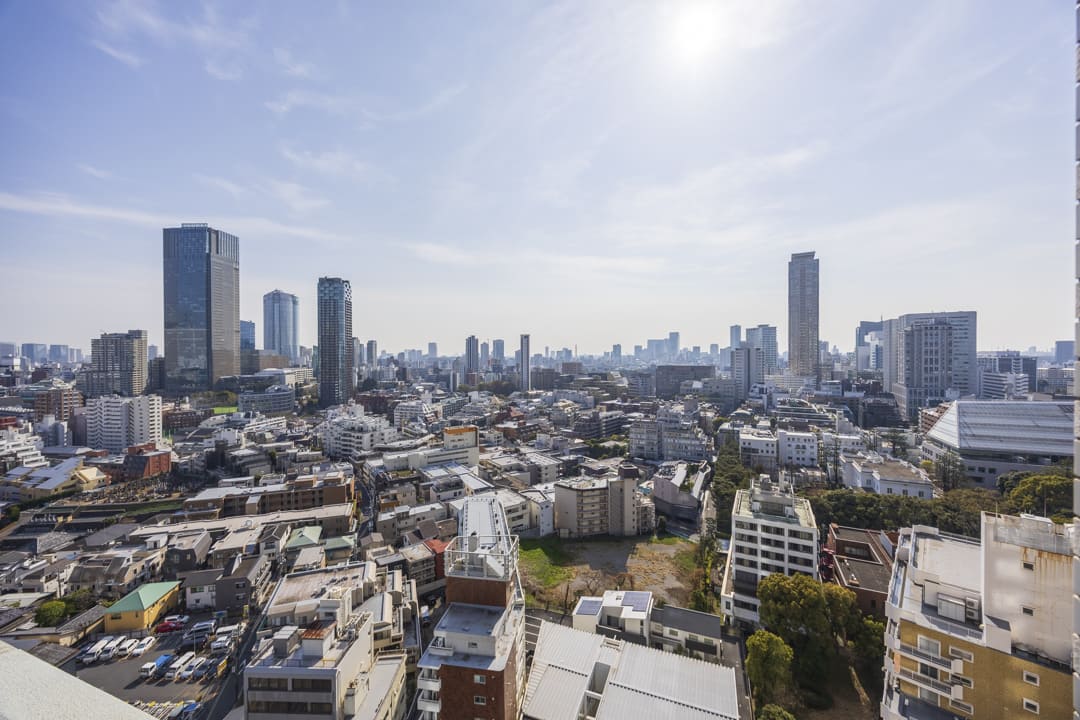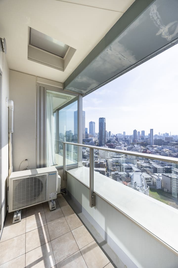 キッチンの窓からは南東側のバルコニーにアクセスできます。日当たりが良好で、目の前には都心のビル群を望む伸びやかな眺望が広がっています。20階という高層階ならではの優雅な空間ですね。