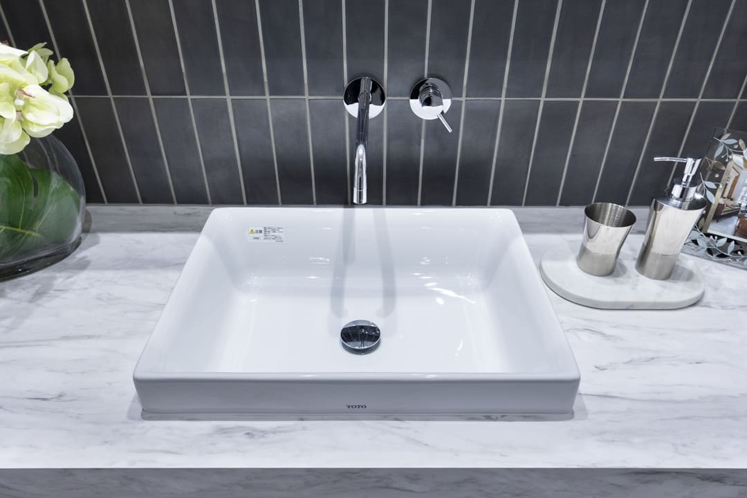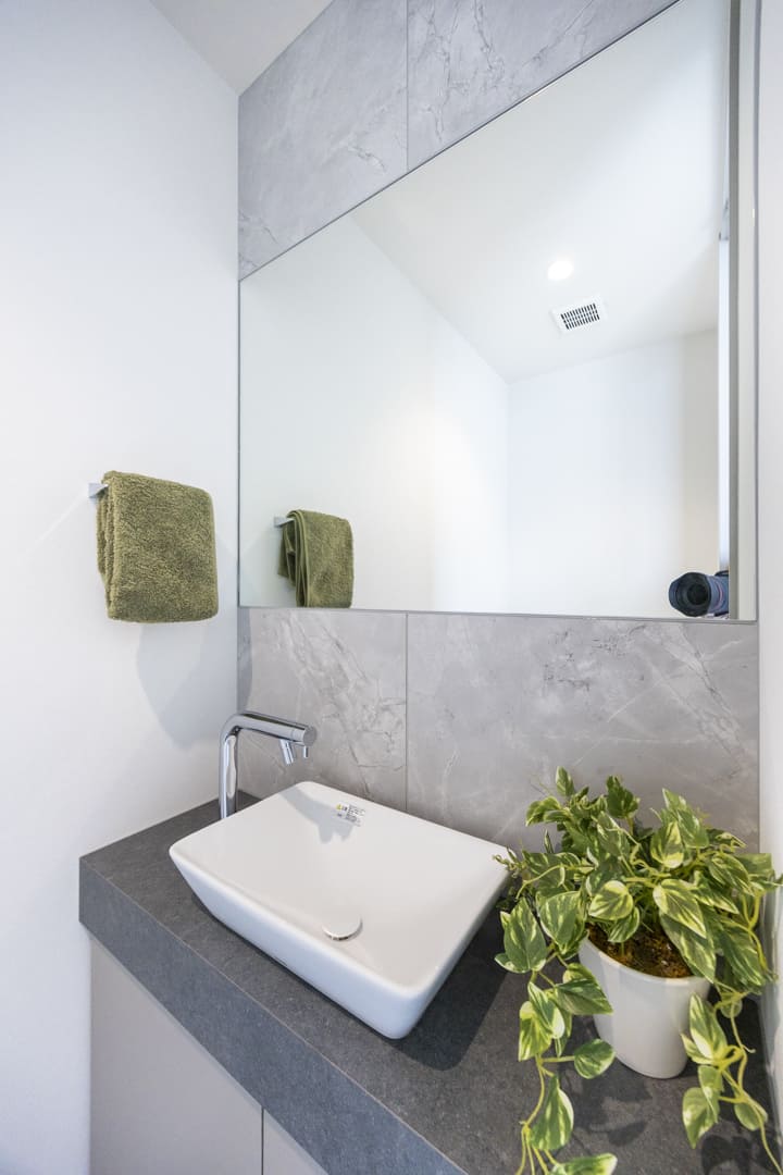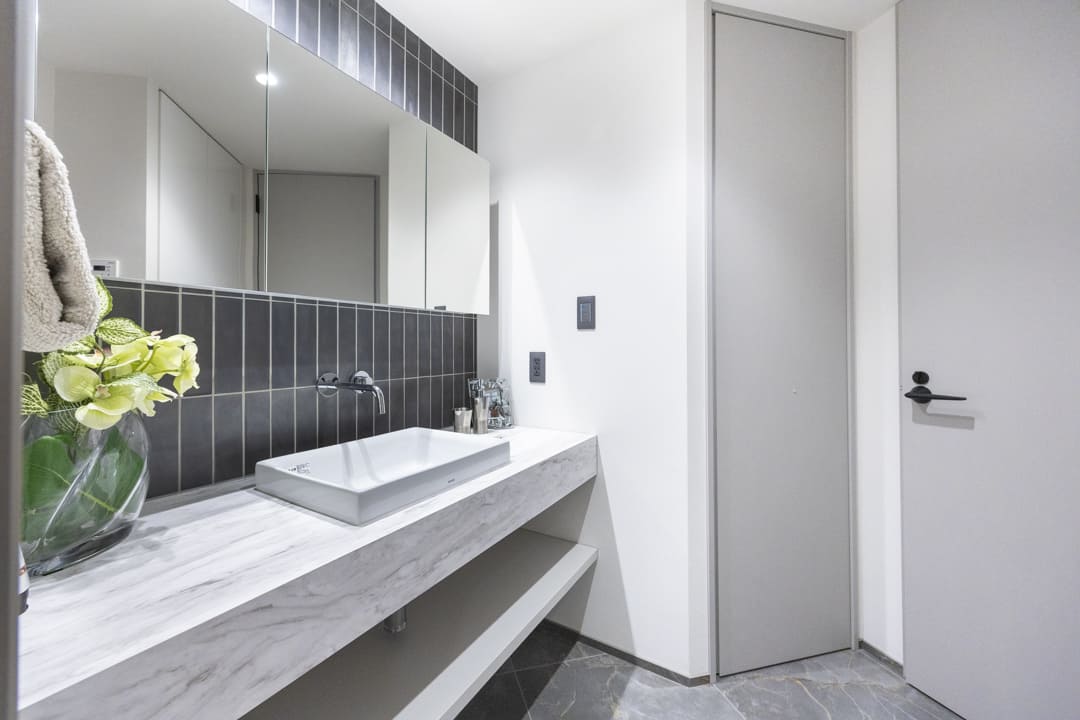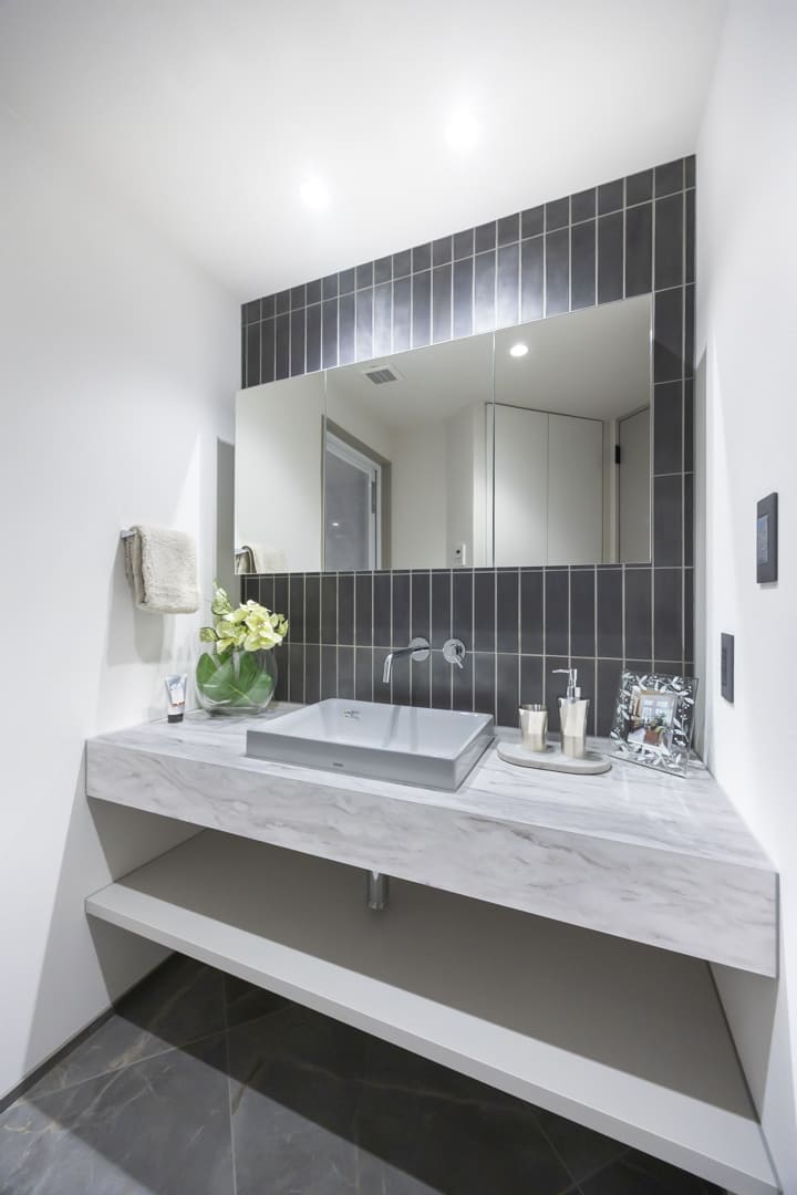 グレートーンでまとめられた洗練された空間の洗面室。置き型式の洗面ボウルはホテルライクな印象を醸し出しています。三面鏡の中には化粧品などを収納できて使い勝手が良好です。また、リネン庫が造られているので、ごちゃごちゃしがちな洗面まわりをきちんと整頓させることができますよ。洗濯機置場に扉が付いているのも便利で◎。